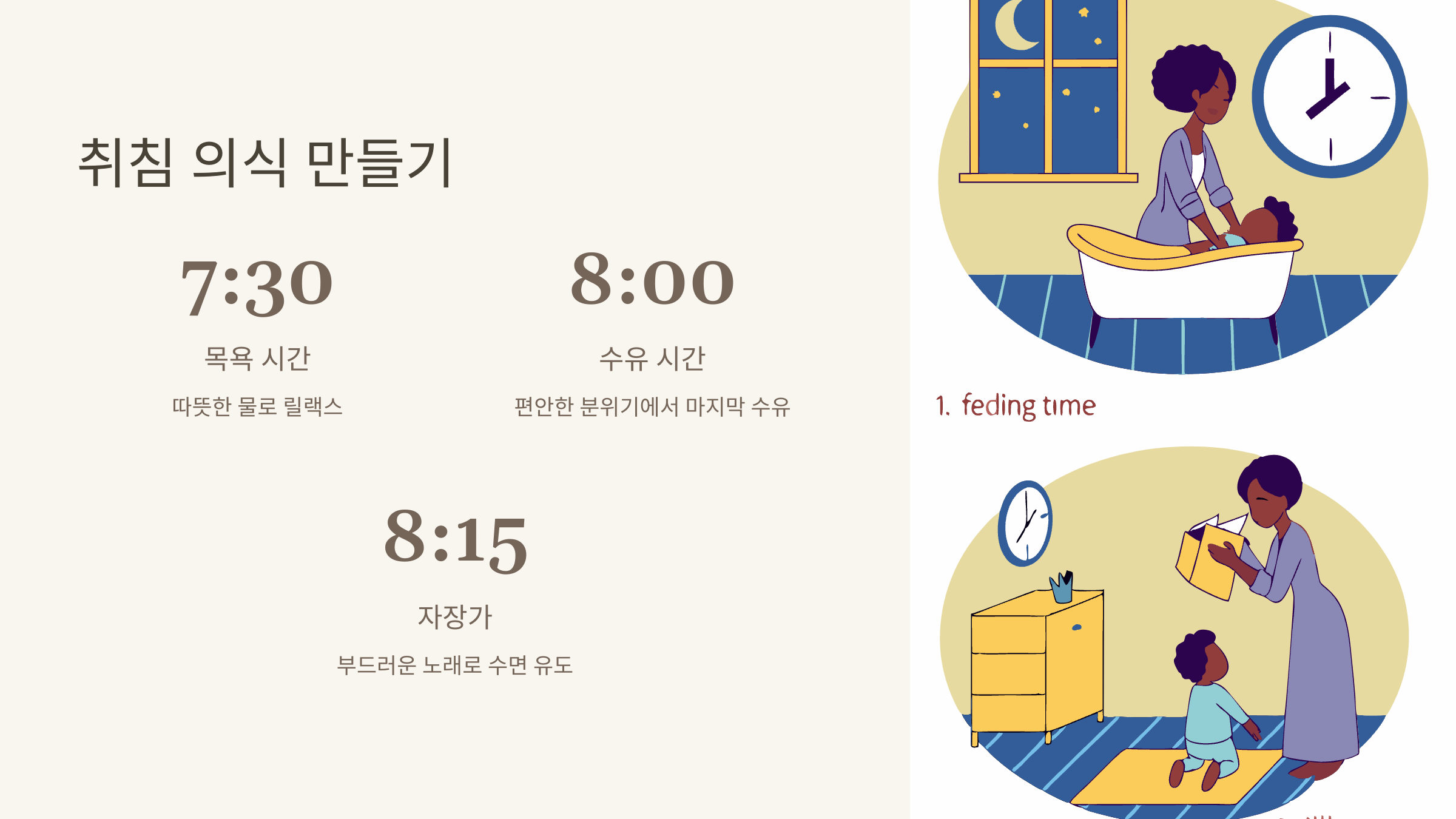 - 7:30 목욕 → 8:00 수유 → 8:15 자장가 부르기