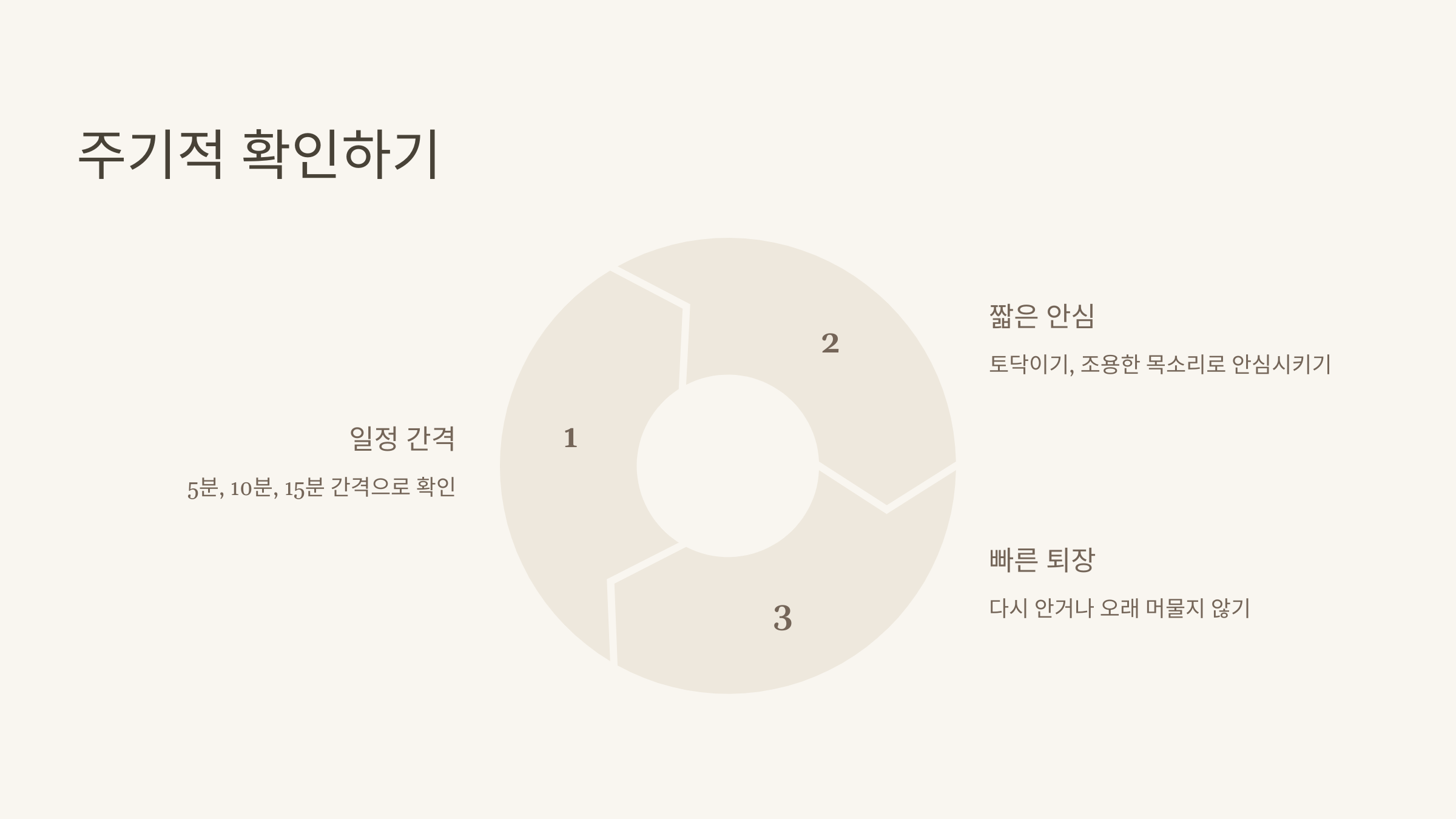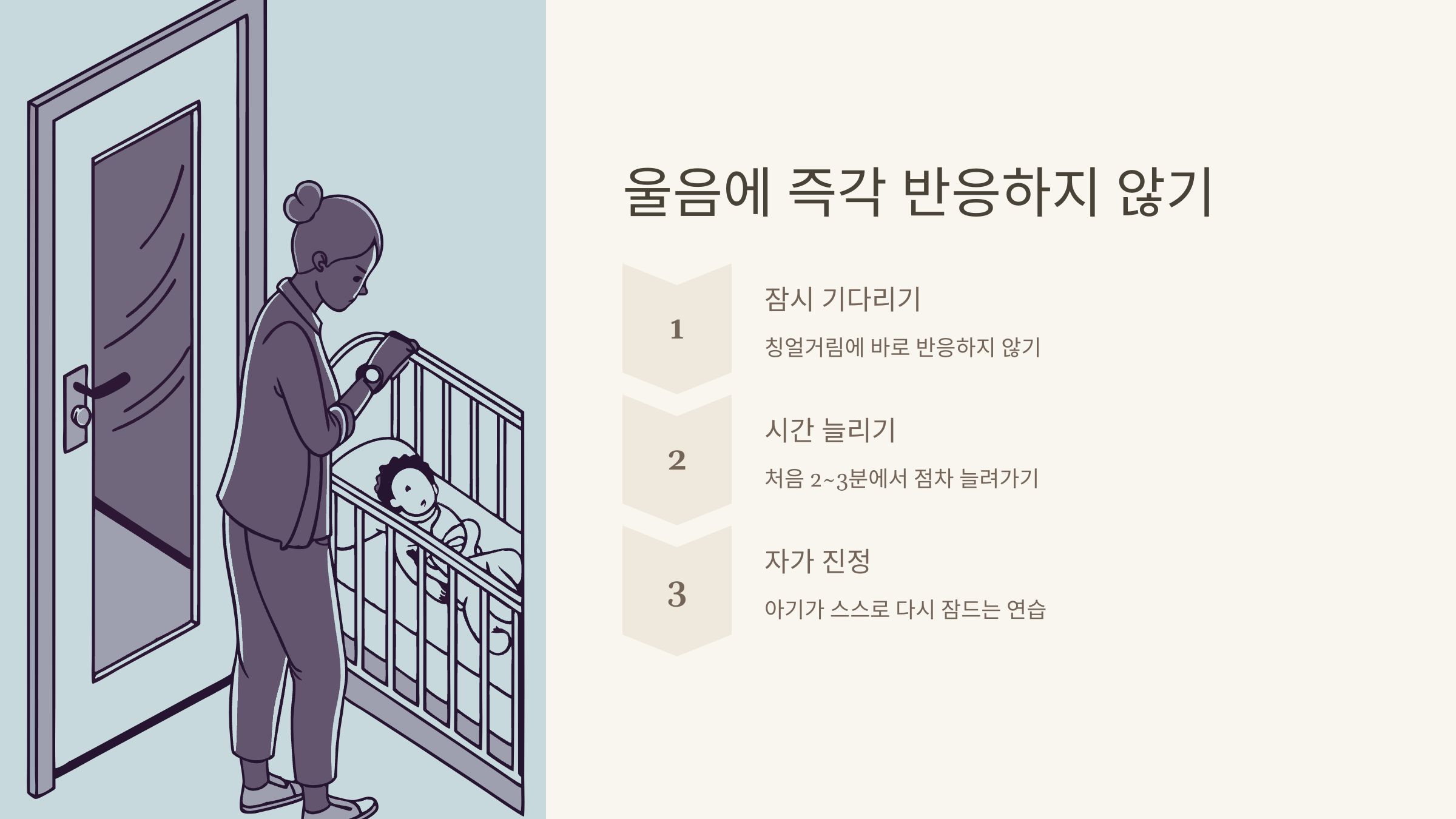 아기가 너무 오래 울면 불안할 수 있어요. 이럴 때는 일정한 간격(5분, 10분, 15분 등)으로 방에 들어가서 짧게 토닥이거나 조용한 목소리로 안심시키는 것이 좋아요. 하지만 다시 안거나 너무 긴 시간을 머물지는 말아야 합니다.