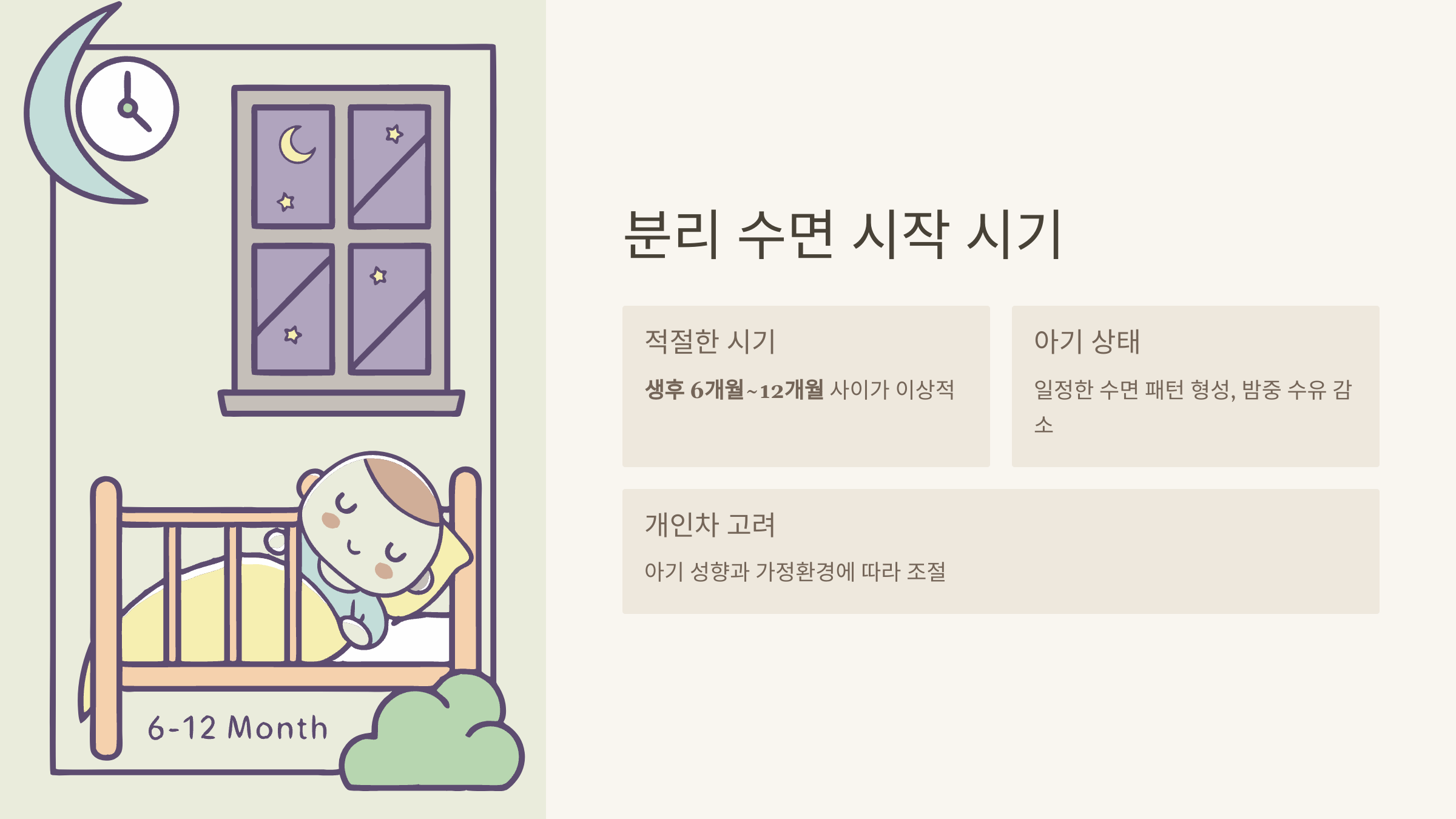 보통 생후 6개월~12개월 사이가 적절한 시기로 여겨집니다. 이 시기는 아기가 일정한 수면 패턴을 갖기 시작하고, 밤중 수유 빈도도 줄어드는 시기라 부모와 아이 모두에게 수면 독립을 연습하기에 좋은 때에요.