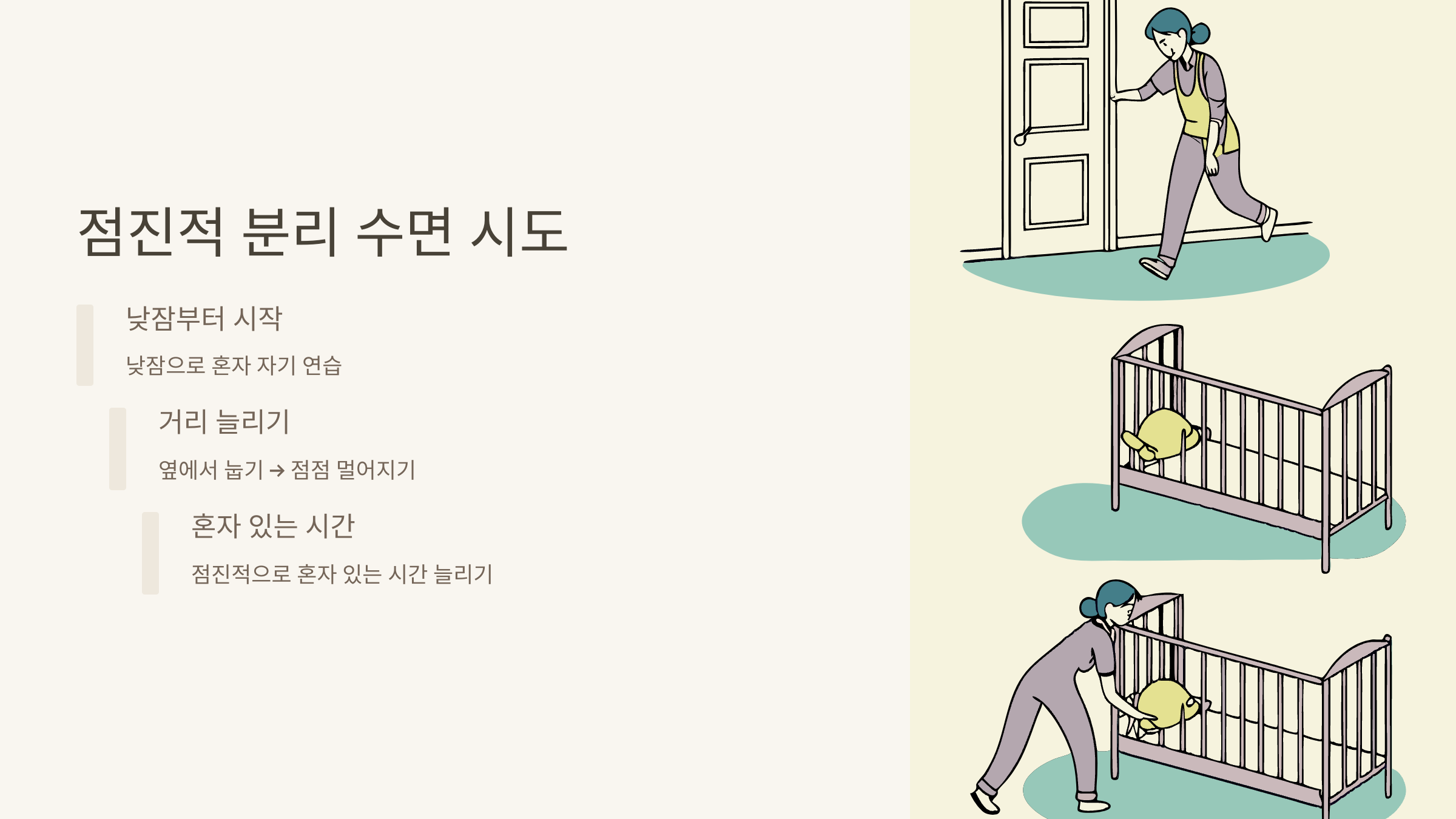 이런 방식으로 서서히 적응할 시간을 주면 아기도 덜 스트레스를 받고 안정적으로 독립적인 수면 습관을 가질 수 있어요.