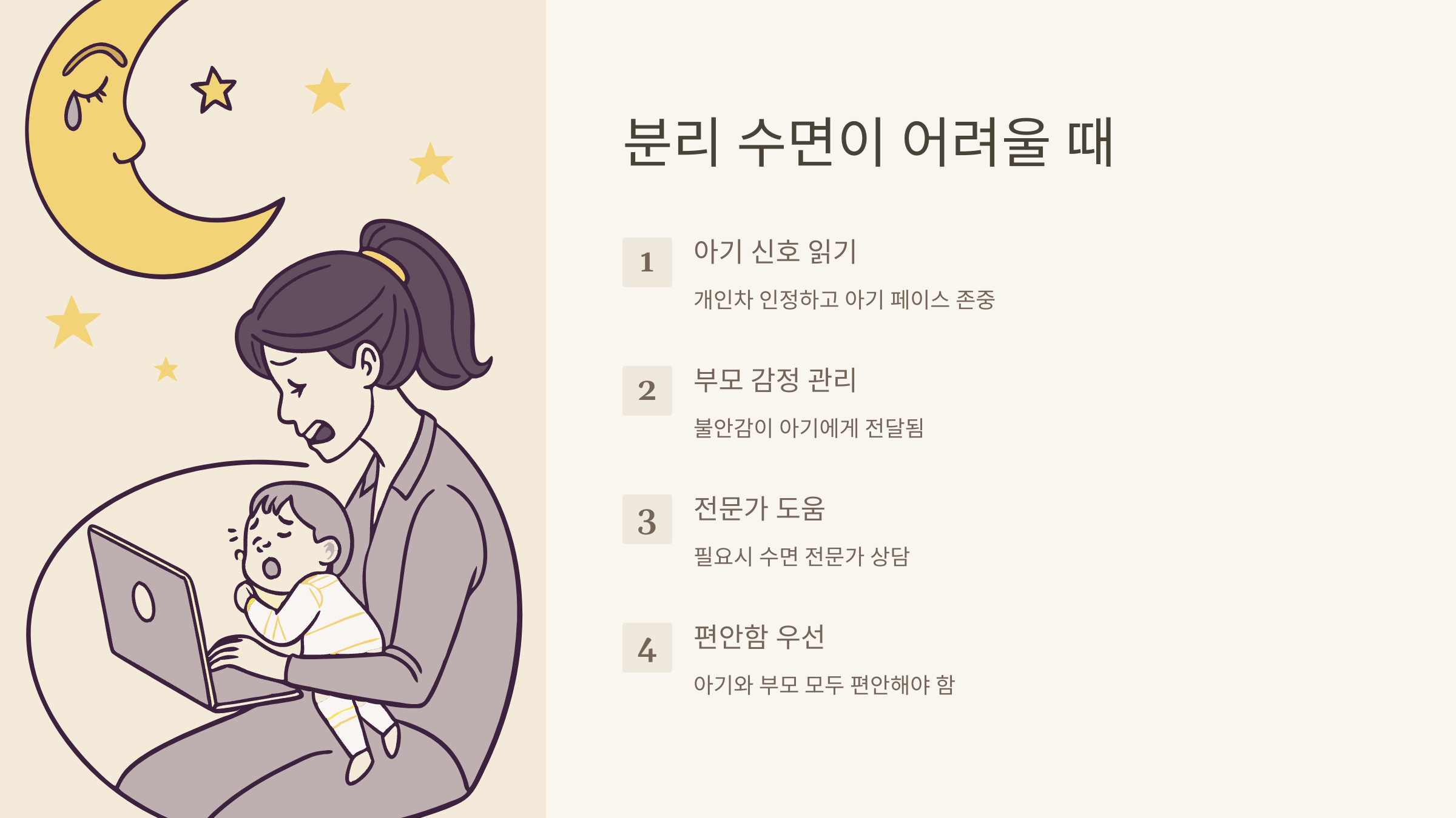 혹시 분리 수면을 시도하면서 어려움을 겪고 계신가요? 댓글로 경험을 공유해 주세요! 함께 이야기하면서 해결 방법을 찾아봐요.