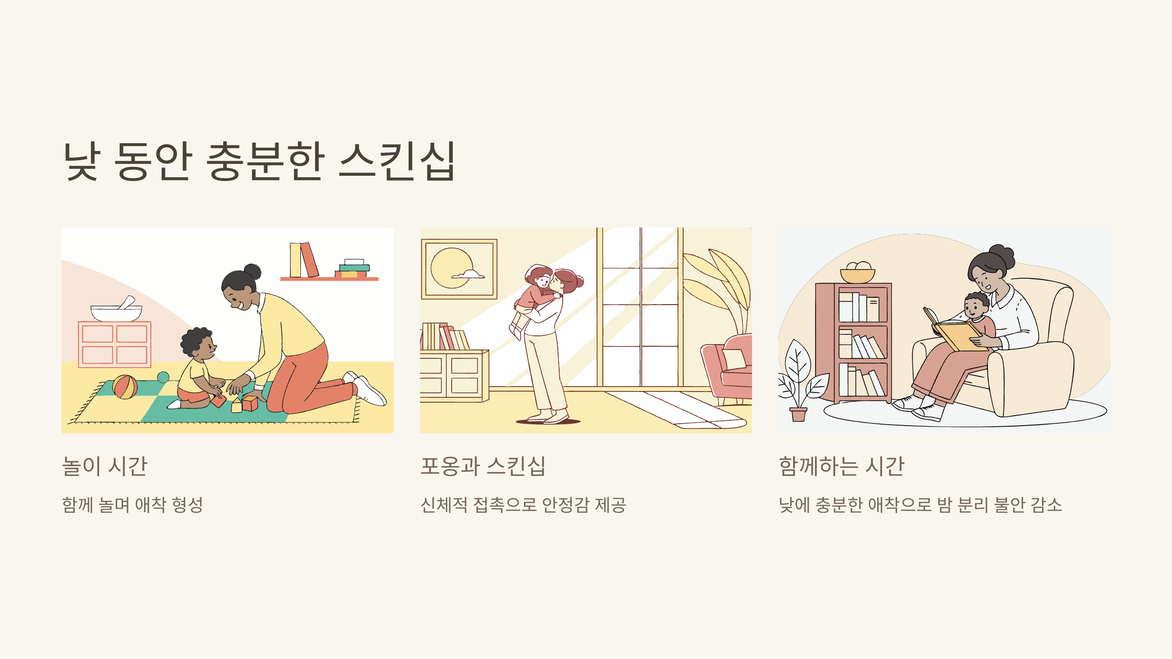 낮 동안 부모와 충분히 애착을 쌓아야 밤에도 안정적인 마음으로 혼자 잘 수 있어요.