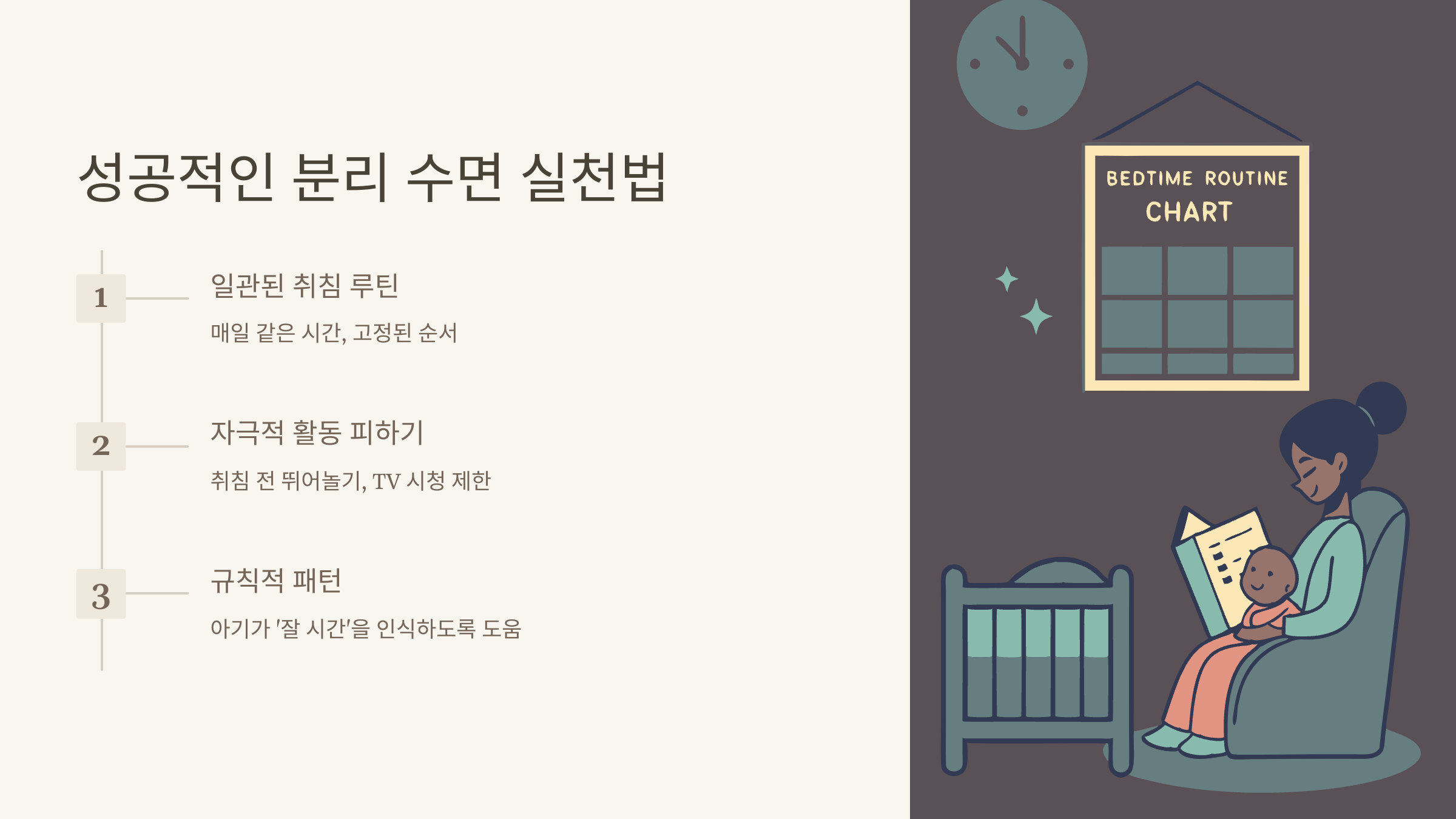 이렇게 규칙적인 루틴을 만들면 아기가 더 쉽게 잠들고 분리 수면도 자연스럽게 받아들일 수 있어요.
