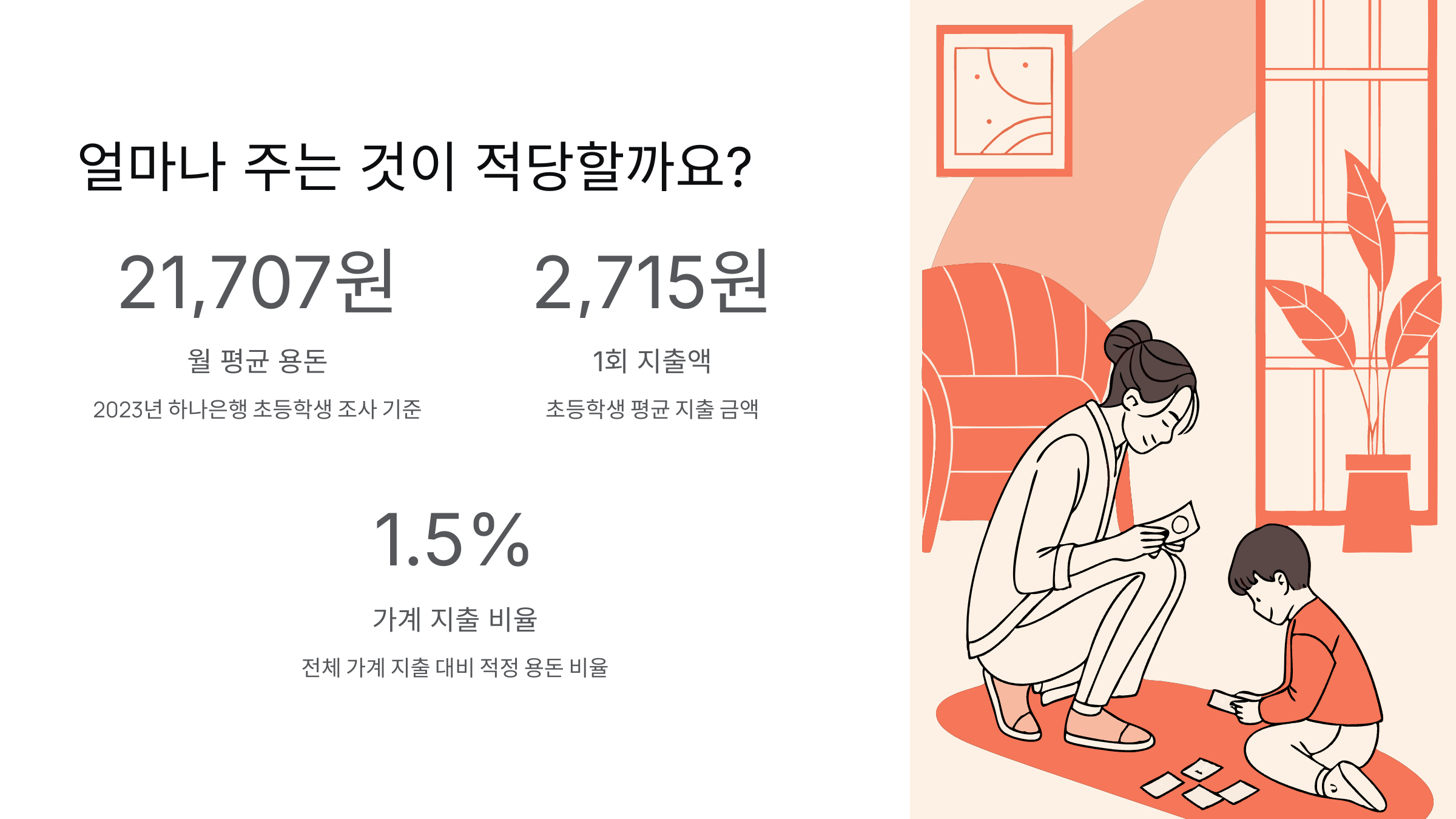 2023년 하나은행 조사에 따르면 초등학생 평균 용돈은 월 21,707원이며, 1회 지출액은 2,715원이라고 해요. 용돈 금액을 정할 때는 다음 세 가지를 고려해보세요: