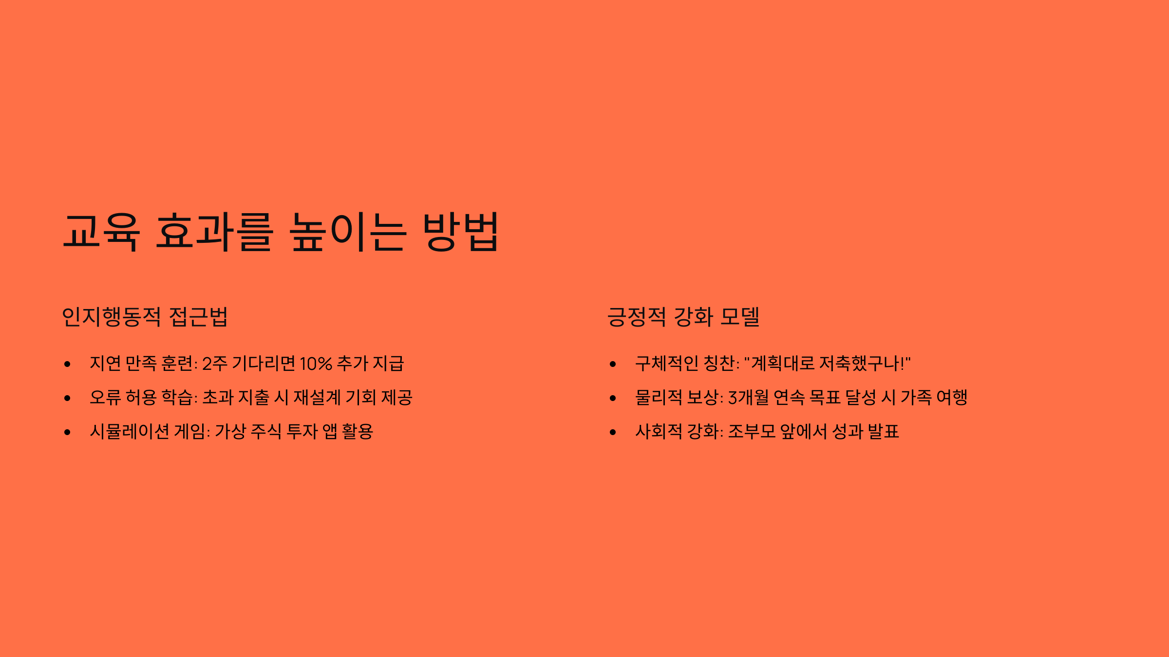 하버드대 교육심리학과의 5년 추적 연구에 따르면, 다음 강화 기법을 적용한 집단은 재무 결정력이 73% 높았다고 해요: