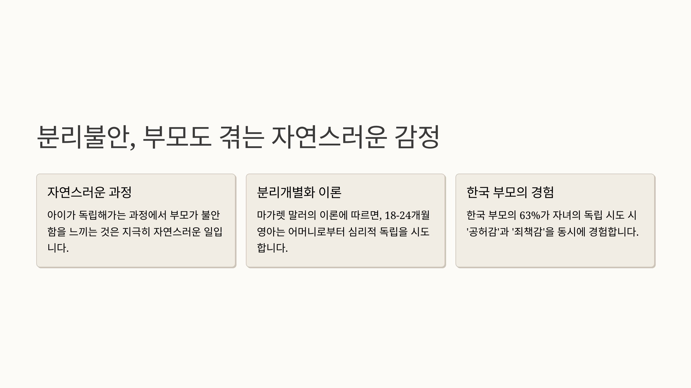 아이가 독립해가는 과정에서 부모가 불안함을 느끼는 것은 지극히 자연스러운 일입니다. 마가렛 말러의 분리개별화 이론에 따르면, 18-24개월 영아는 어머니로부터 심리적 독립을 시도하며, 이 과정에서 어머니의 반응이 아동의 자아정체감 형성에 결정적 영향을 미친다고 합니다.