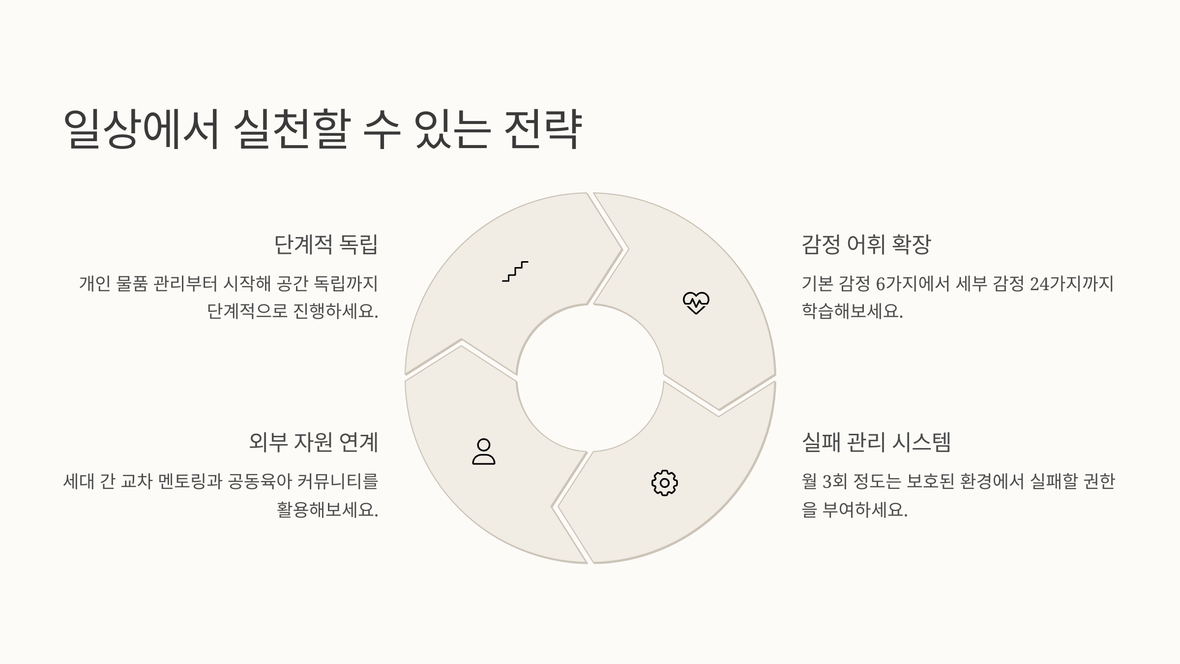 - 정서적 경계 설정하기: 감정을 나누는 특별한 시간대를 정해보세요(예: 오후 7-8시를 '감정 카페' 시간으로)