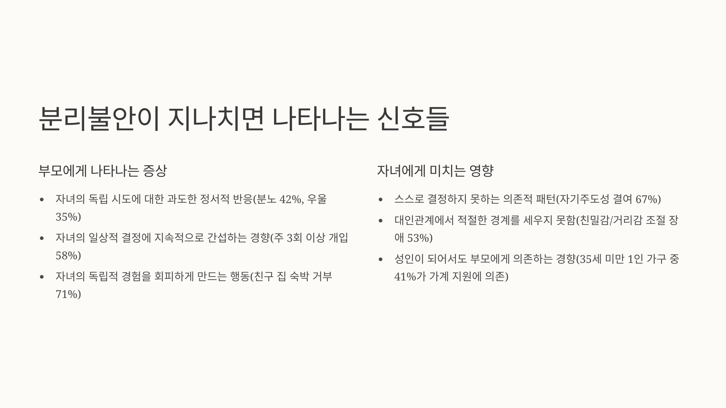 - 자녀의 독립 시도에 대한 과도한 정서적 반응(분노 42%, 우울 35%)