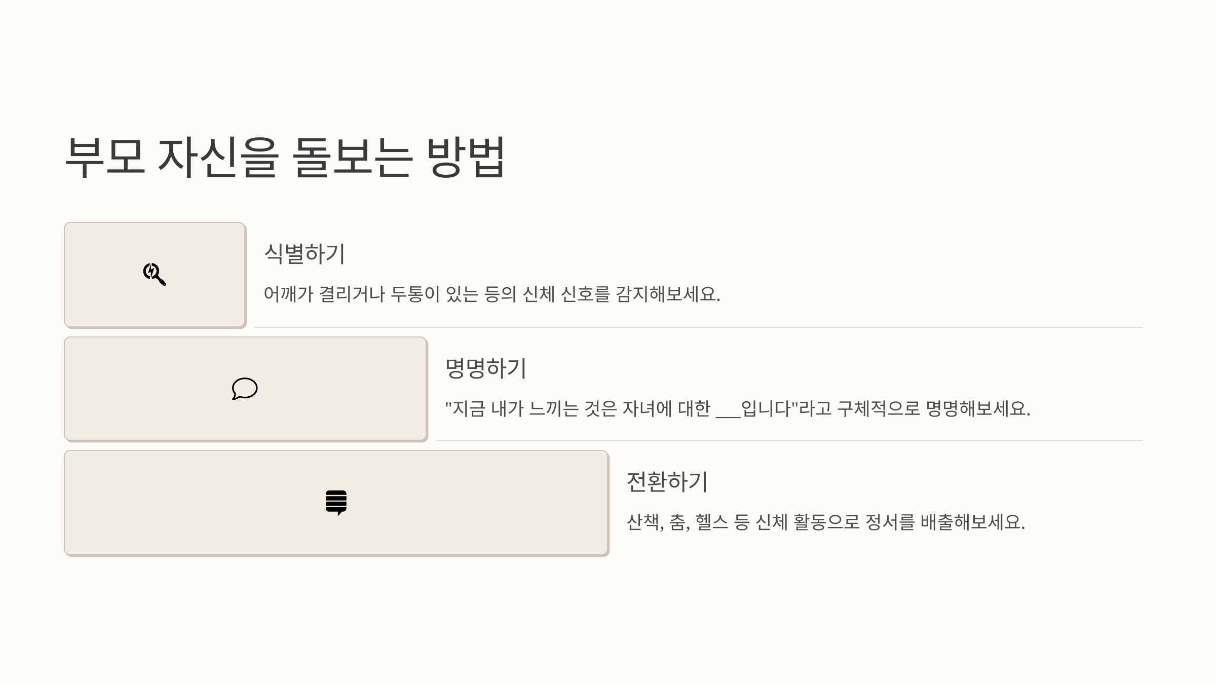 - 명명하기: "지금 내가 느끼는 것은 자녀에 대한 ___입니다"라고 구체적으로 명명해보세요.