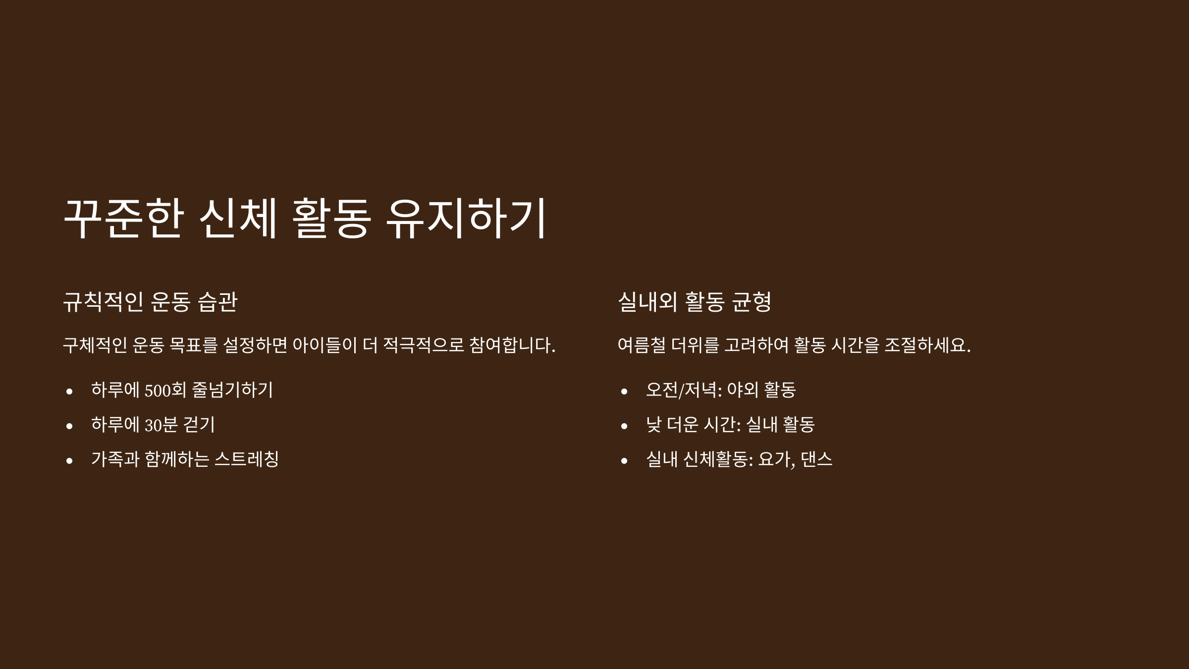 규칙적인 운동은 아이들의 신체 발달뿐만 아니라 정신 건강에도 매우 중요해요. "하루에 500회 줄넘기하기", "하루에 30분 걷기"와 같이 구체적인 운동 목표를 설정하면 아이들이 더 적극적으로 참여할 수 있어요.