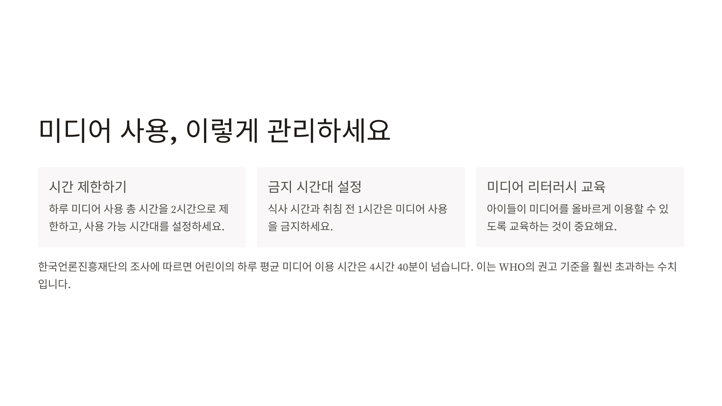 - 식사 시간과 취침 전 1시간은 미디어 사용 금지
