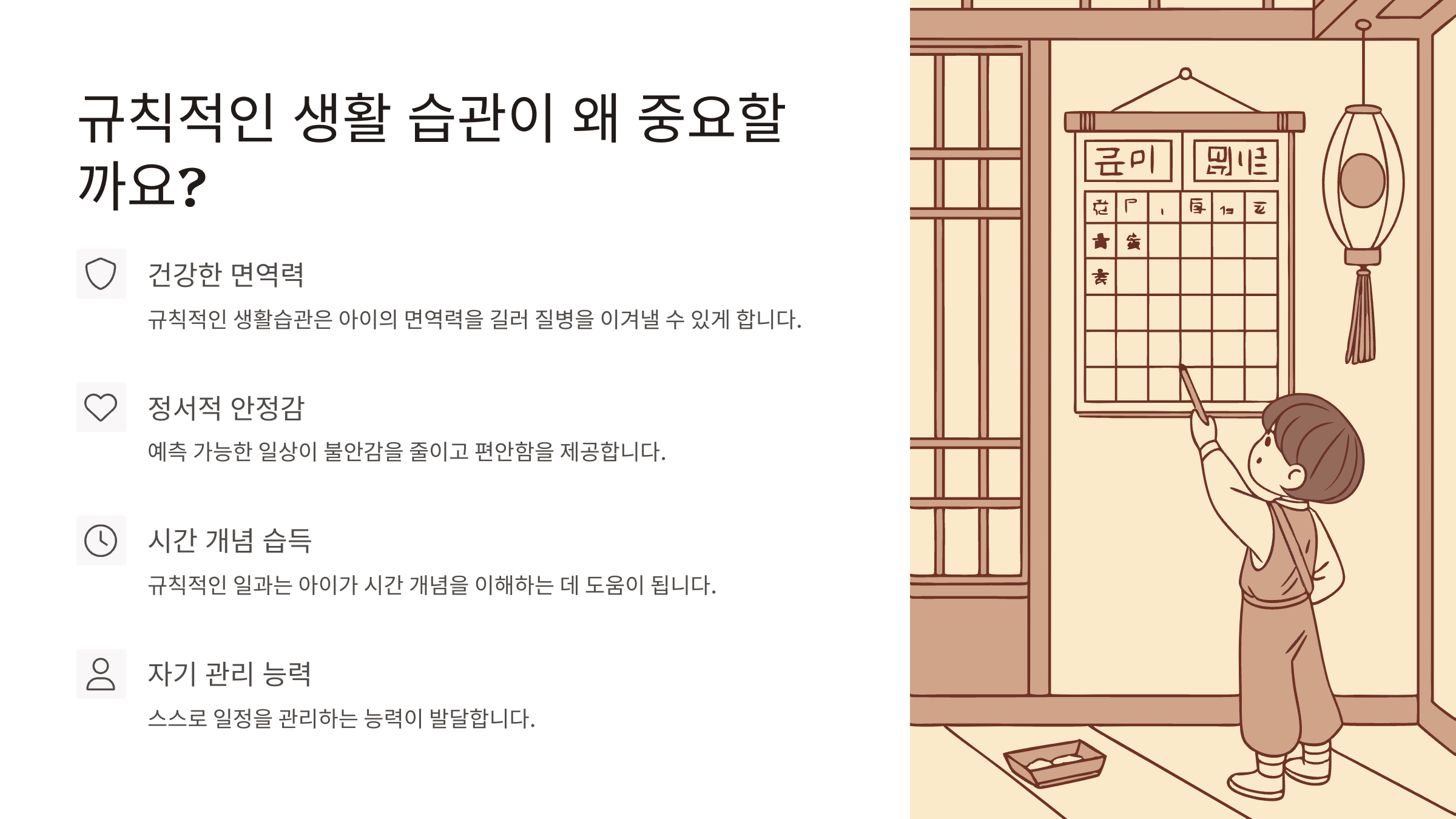 규칙적인 생활 습관은 아이들에게 다음과 같은 혜택을 줍니다: