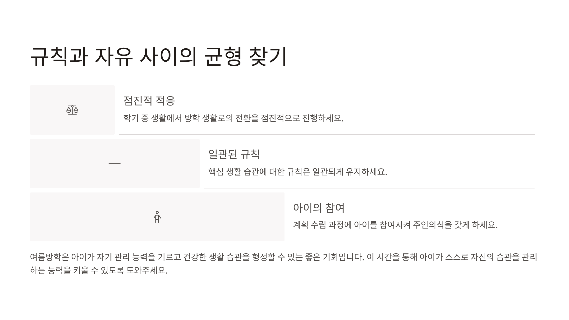 - 일관된 규칙: 핵심 생활 습관(수면, 식사, 미디어 사용 등)에 대한 규칙은 일관되게 유지하세요.