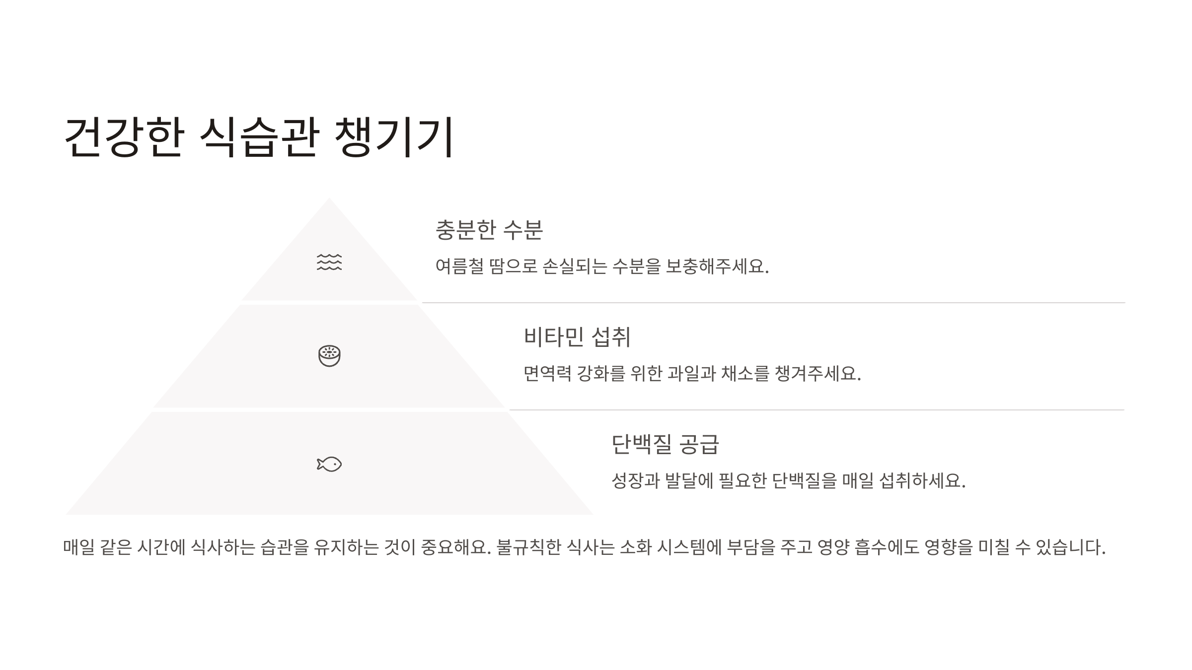 매일 같은 시간에 식사하는 습관을 유지하는 것이 중요해요. 불규칙한 식사는 소화 시스템에 부담을 주고 영양 흡수에도 영향을 미칠 수 있어요.