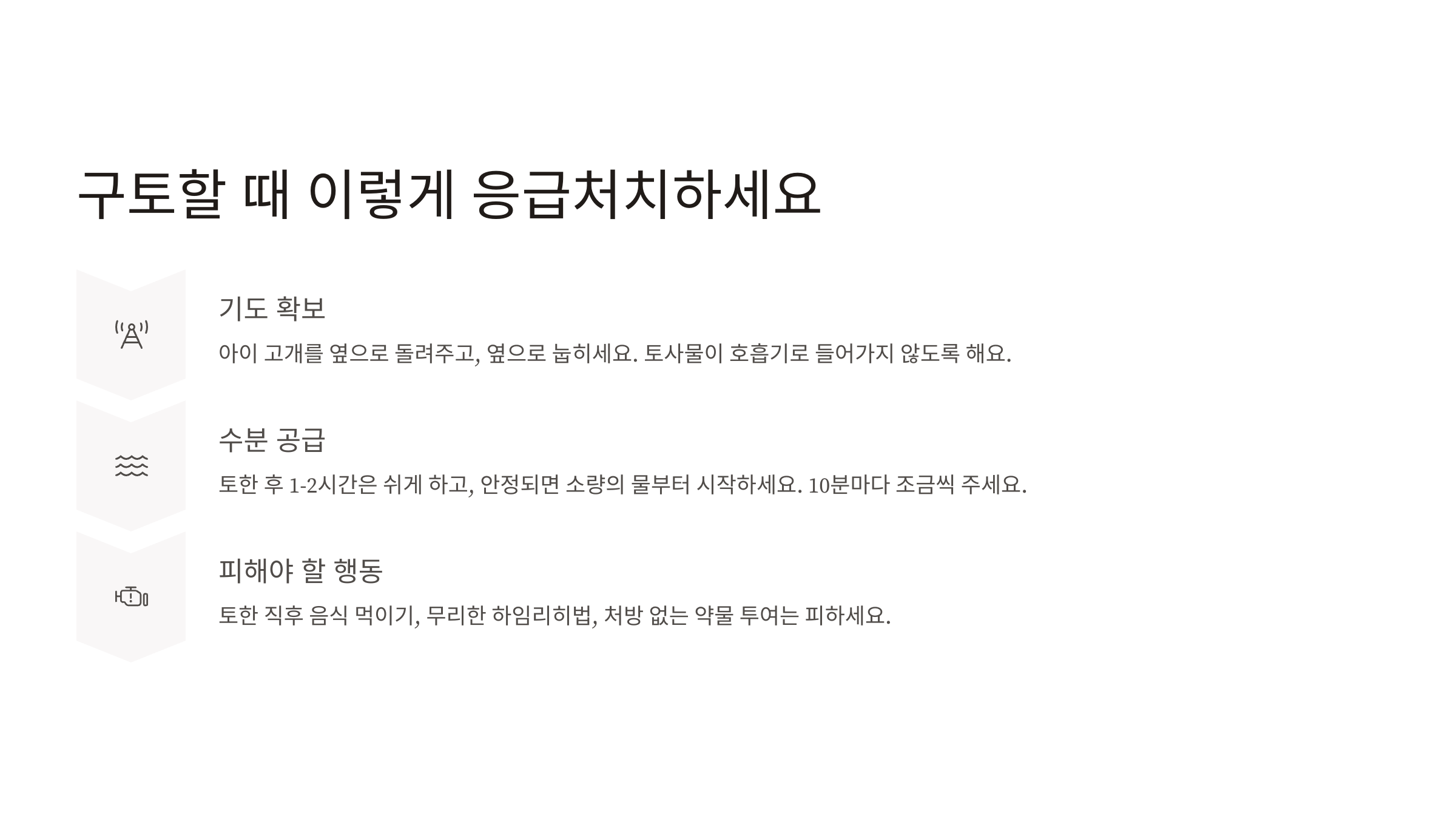 - 아이가 구토할 때는 입 주변을 닦아주고, 기도가 막히지 않도록 고개를 옆으로 돌려줍니다.