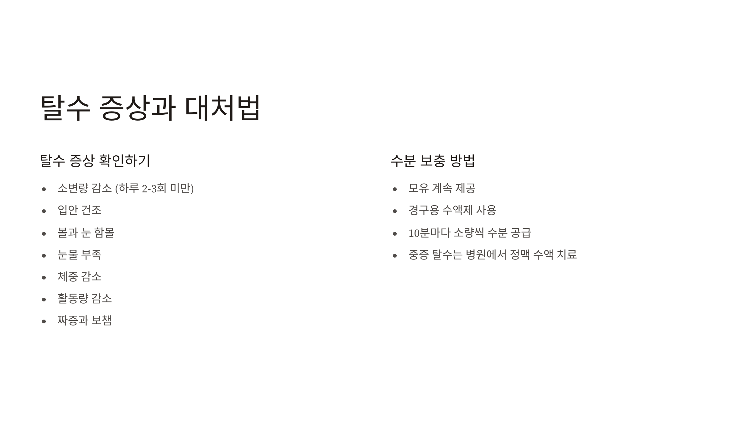 - 처음 24시간 정도는 고형식을 피하고 수분 공급에 집중하세요.
