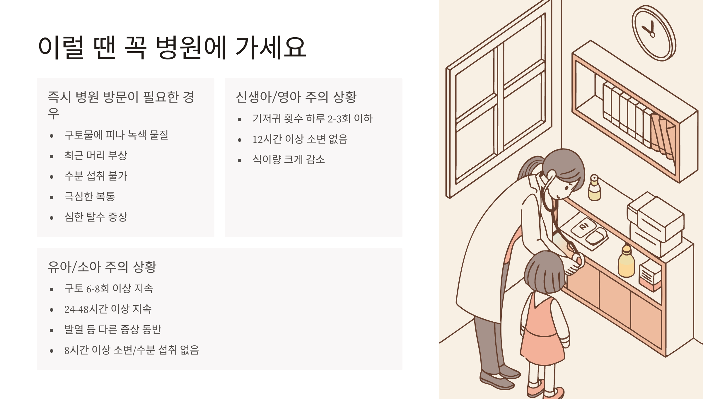 탈수 증상이 나타나거나 위에서 언급한 위험 신호가 있을 경우에는 주저하지 말고 즉시 의료 도움을 구하세요. 특히 신생아나 영아의 경우 탈수가 빠르게 진행될 수 있으므로 더욱 주의가 필요합니다.
