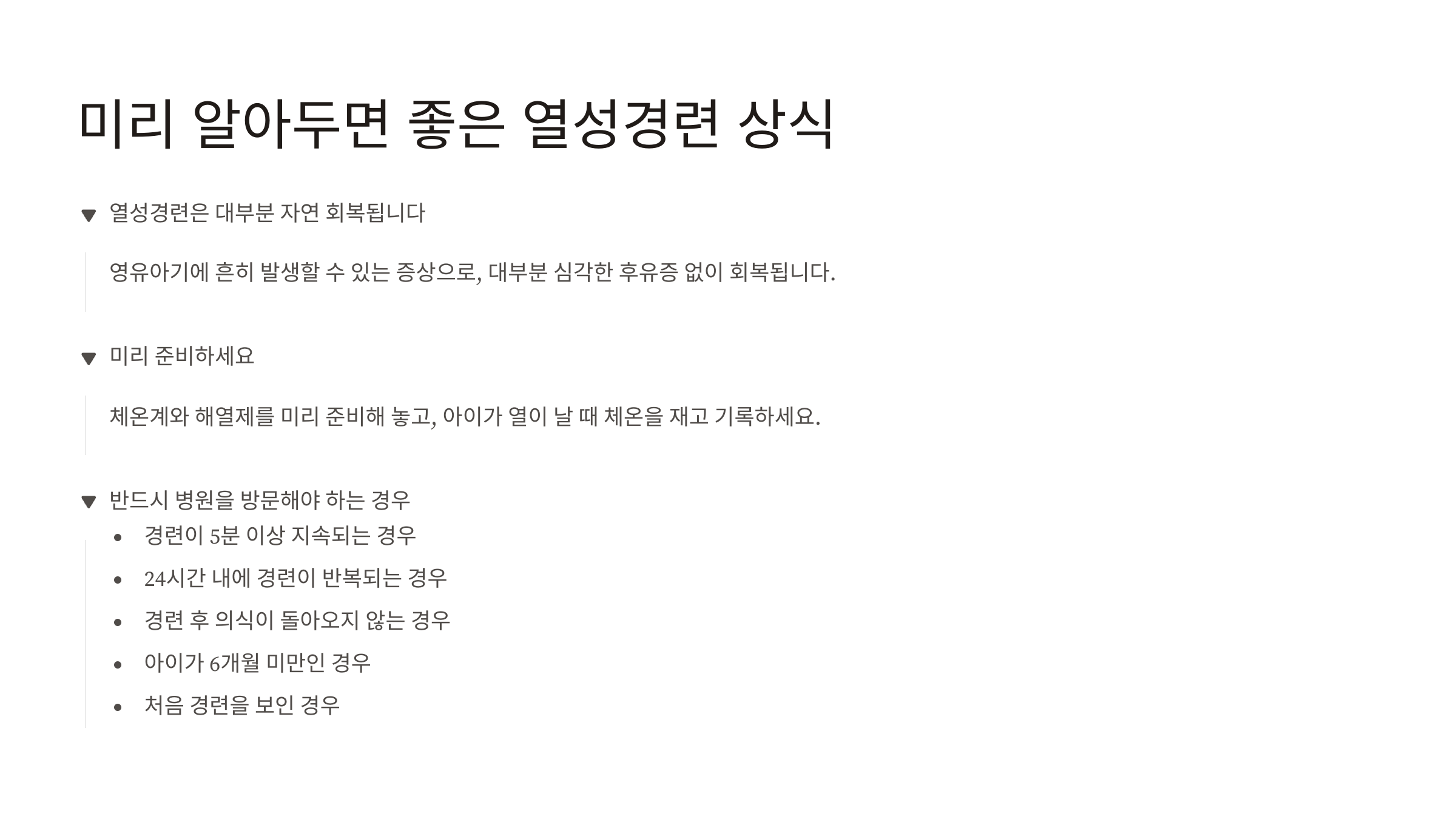 - 경련이 멈추고 의식이 회복되었더라도, 열성경련의 원인을 파악하기 위해 의사의 진료를 받는 것이 좋습니다.