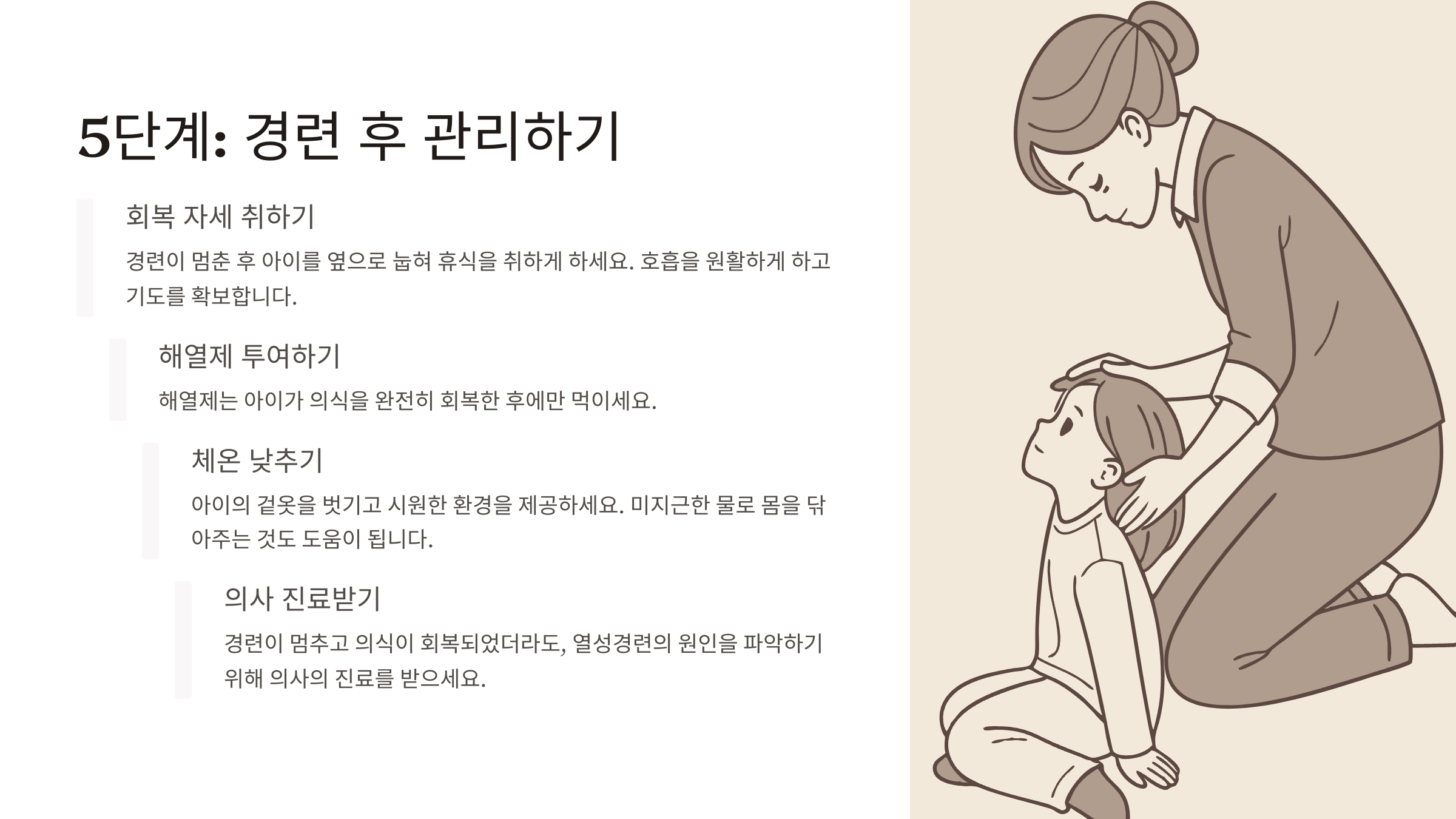마지막 단계는 경련이 끝난 후 아이를 안정시키고 적절한 후속 조치를 취하는 것입니다.