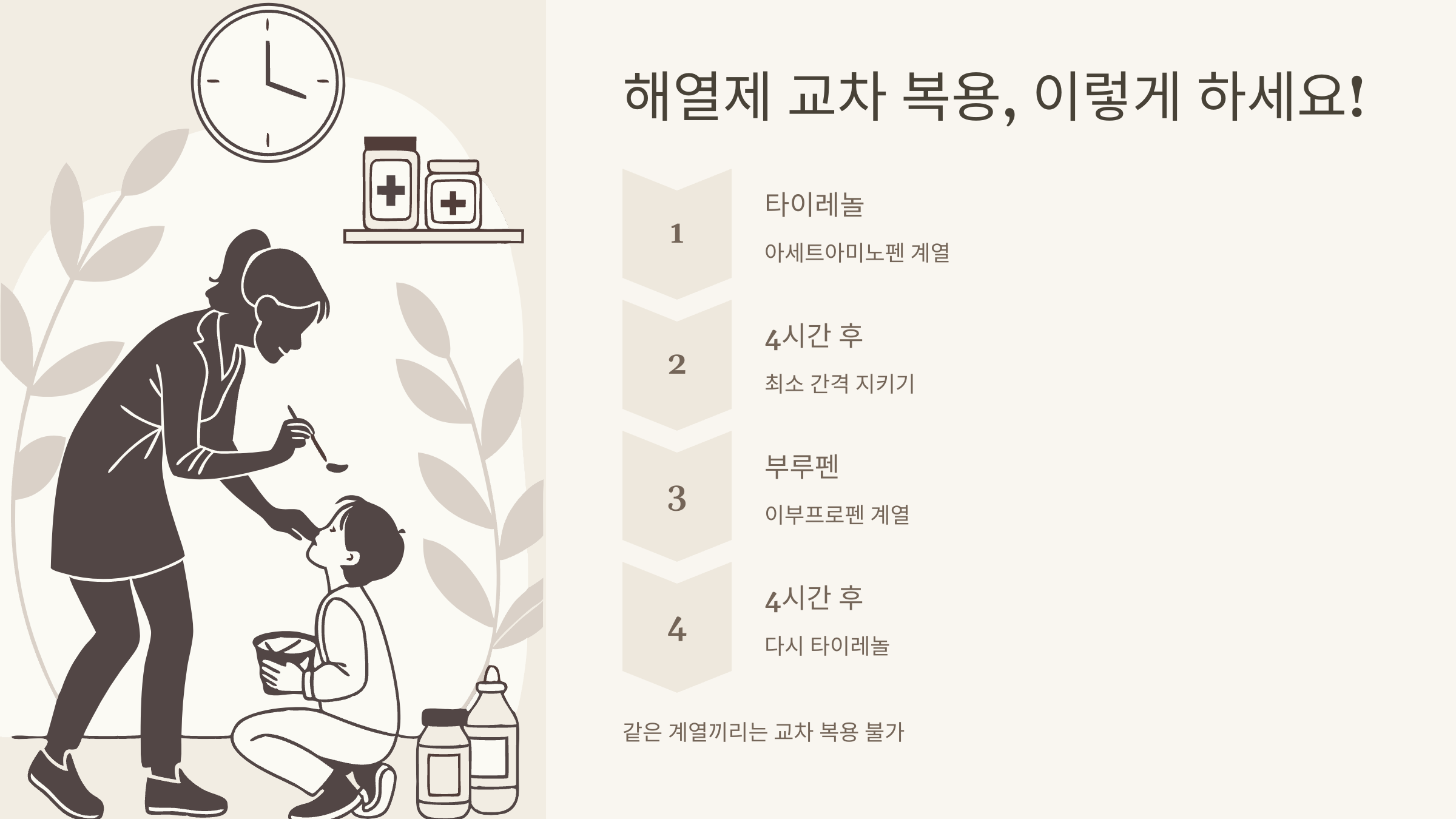 해열제를 한 종류만 사용하면 6시간 간격을 지켜야 하지만, 다른 계열의 해열제와 교차 복용하면 4시간마다 투여 가능합니다.