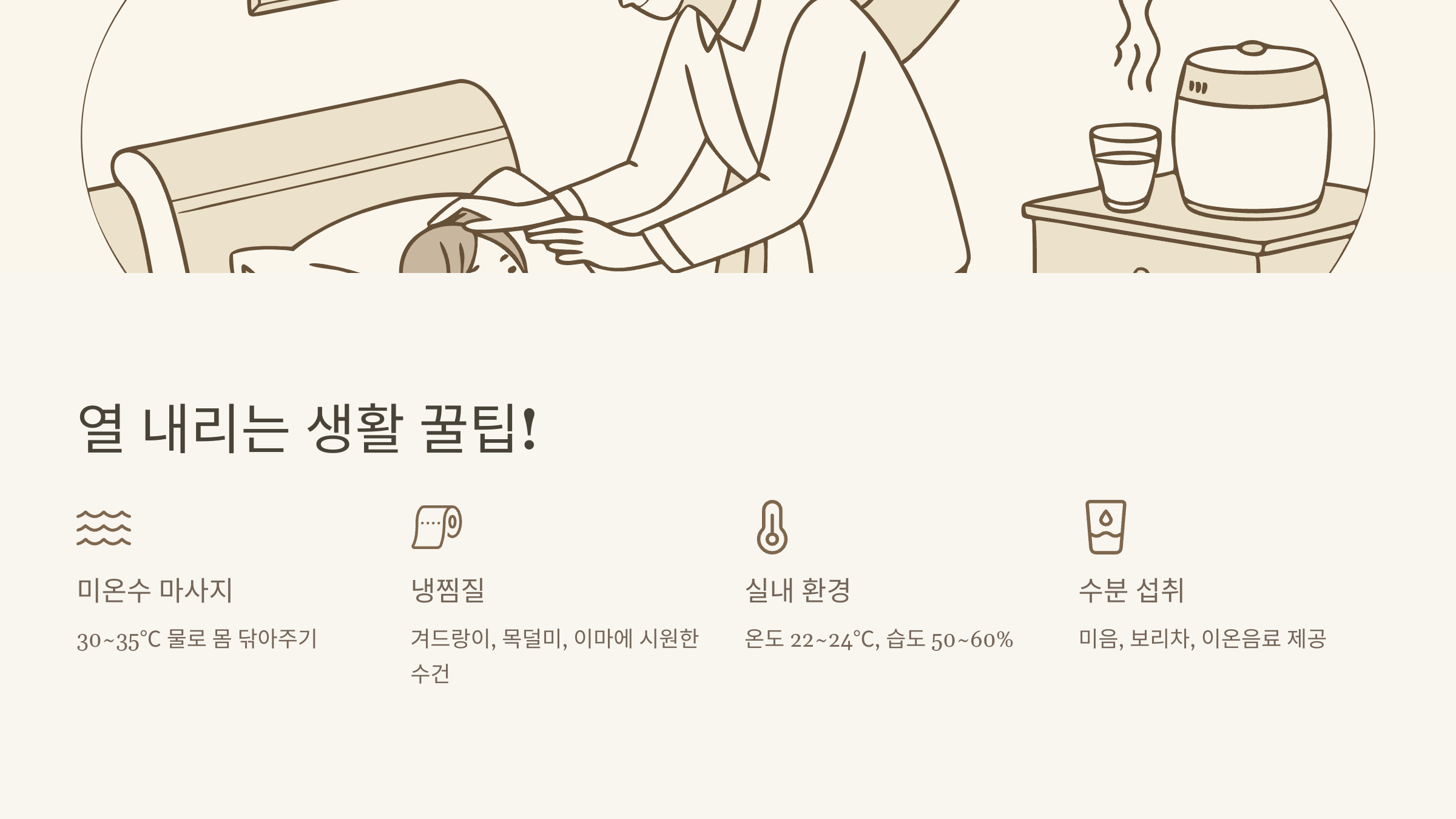 - 미온수(30~35℃)로 몸을 닦아주기 (찬물이나 알코올 사용은 금지)
