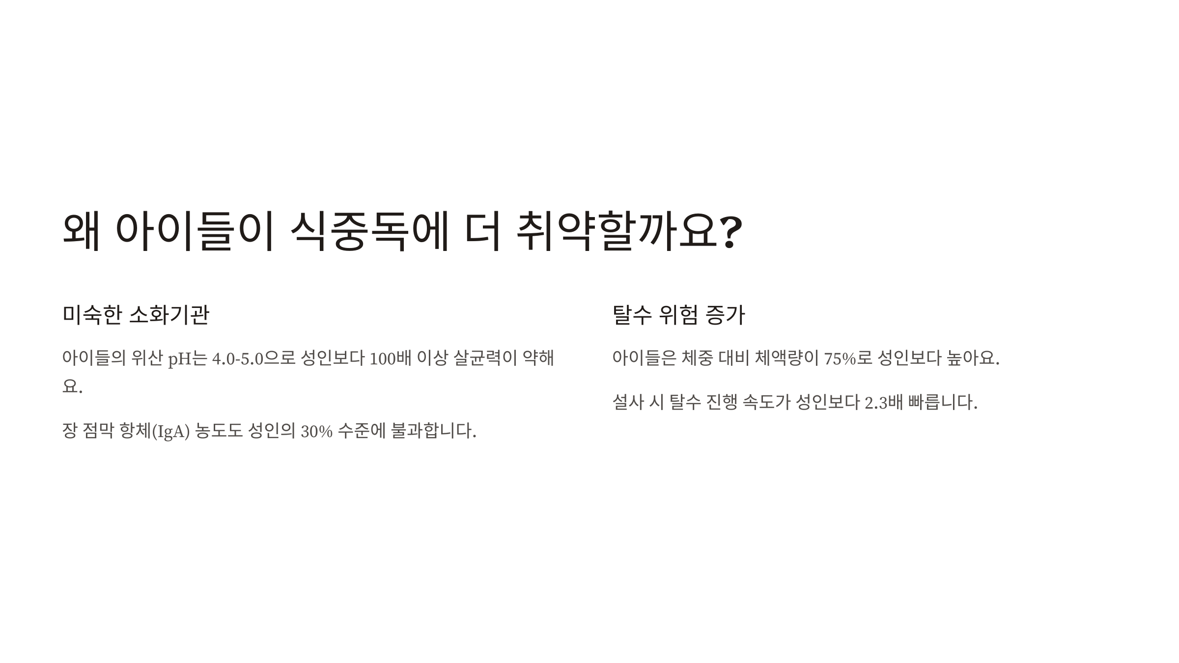 아이들은 위산의 pH가 4.0~5.0으로 성인(pH 1.5~3.5)보다 훨씬 높아요. 이 말은 위산의 살균력이 성인보다 100배 이상 약하다는 뜻이죠. 또한 장 점막에서 분비되는 항체(IgA) 농도도 성인의 30% 수준에 불과해요. 그래서 대장균 같은 세균이 아주 적은 양으로도 감염될 수 있답니다.