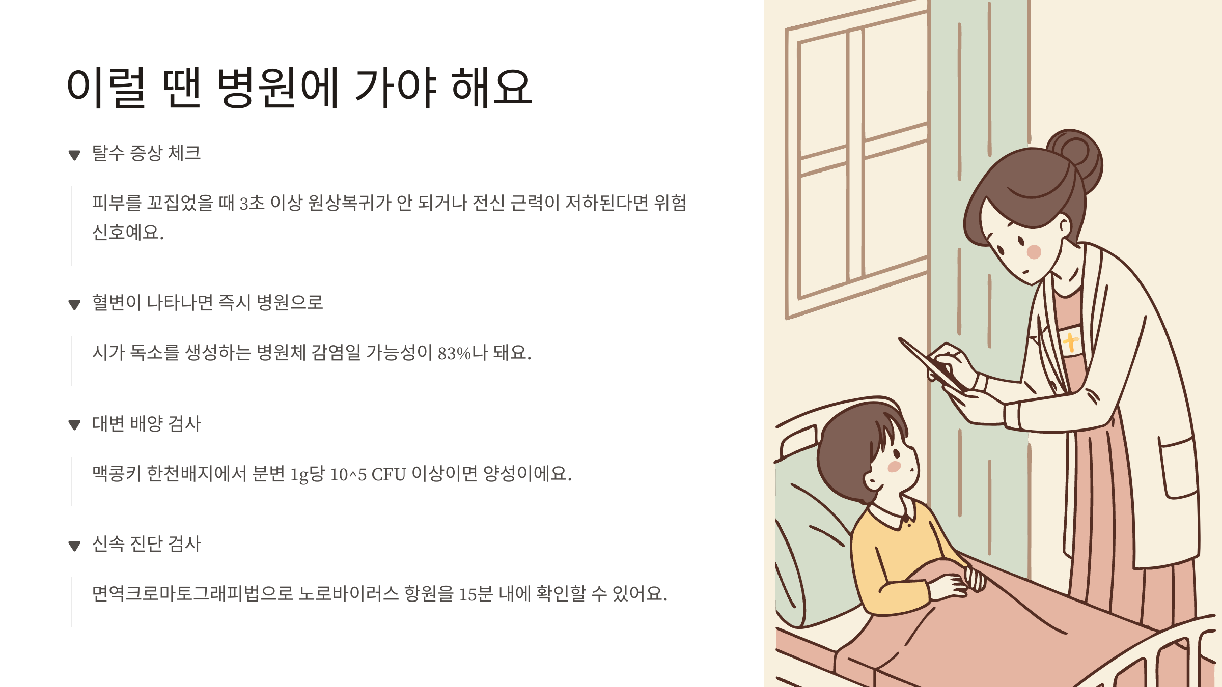 - 탈수 증상 체크: 피부를 꼬집었을 때 3초 이상 원상복귀가 안 되거나 전신 근력이 저하된다면 위험 신호예요.