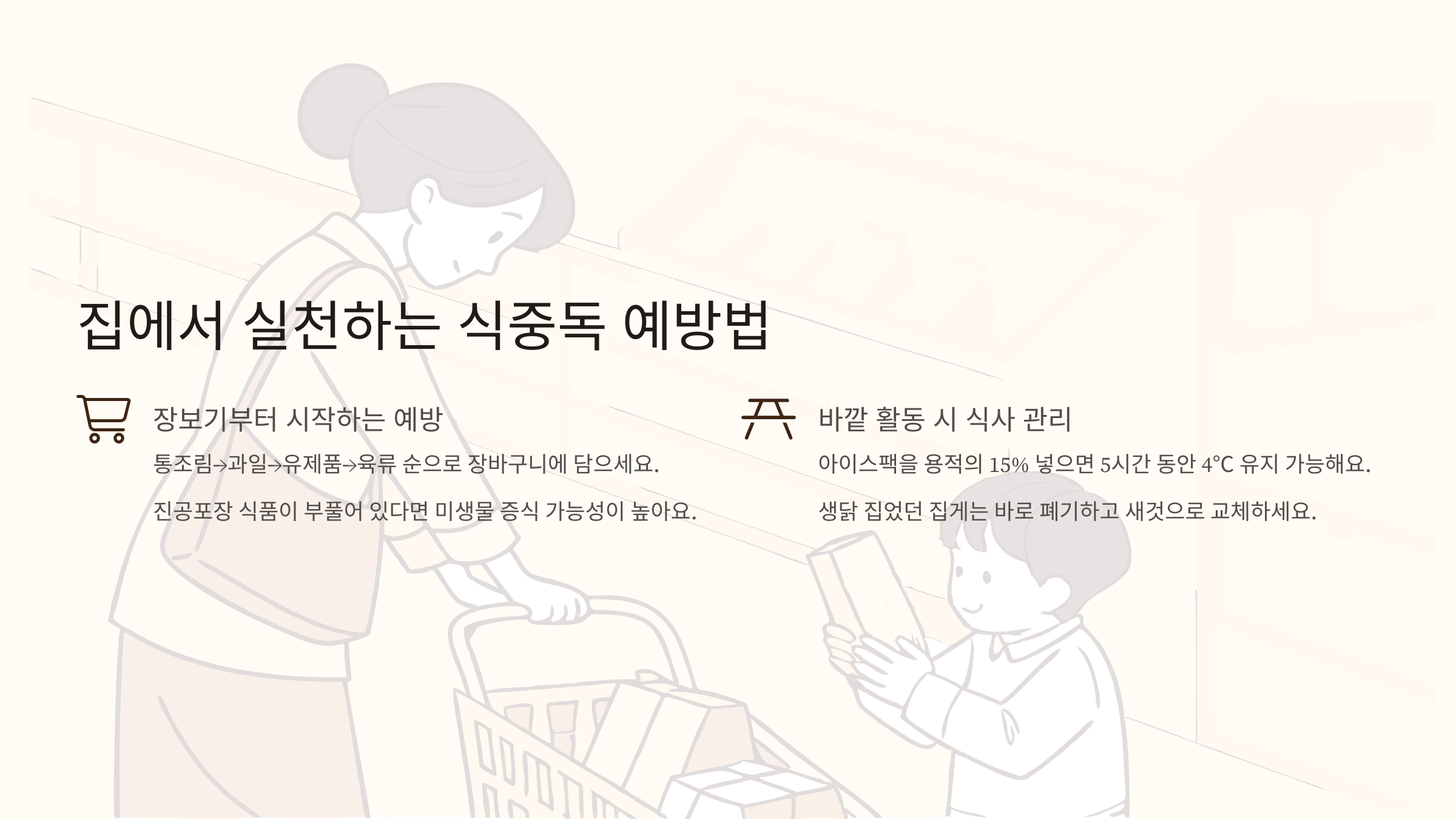안녕하세요! 날씨가 더워지면서 음식이 상하기 쉬운 계절이 왔어요. 특히 면역력이 약한 아이들은 식중독에 더 취약하답니다. 식약처 통계에 따르면 여름철(6~8월)에 전체 식중독의 47%가 발생하고, 그중 38%가 5세 미만 아이들이라고 해요. 오늘은 여름철 아이 식중독 예방법에 대해 알아볼게요!
