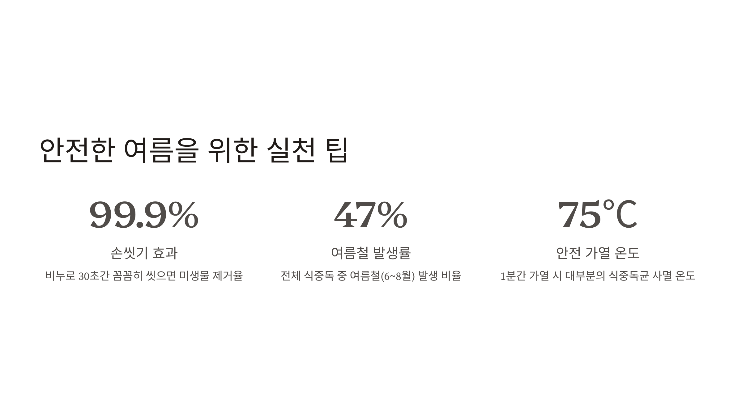 - 손씻기가 기본: 비누로 30초간 꼼꼼히 씻으면 미생물 제거율이 99.9%에 달해요.