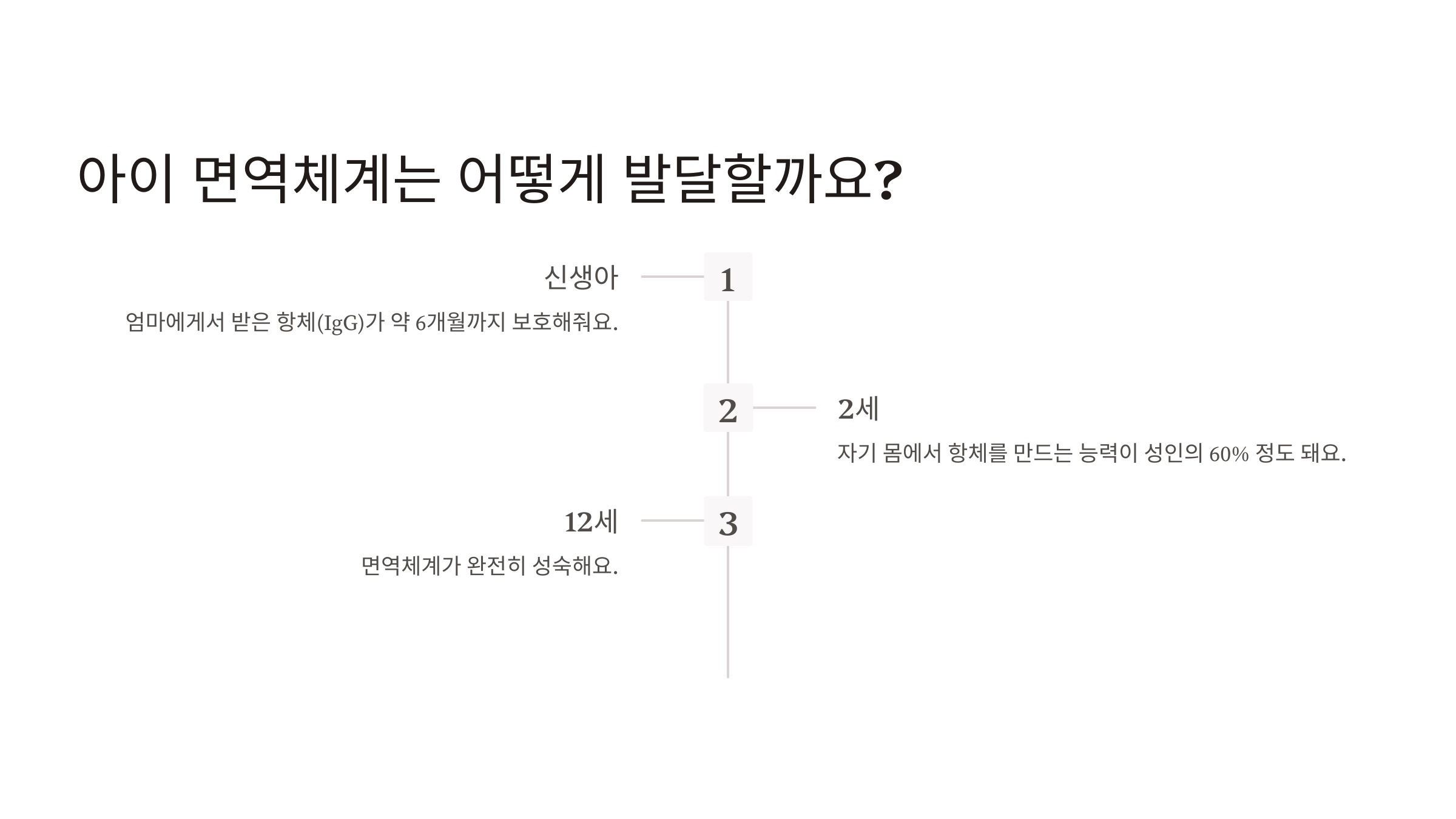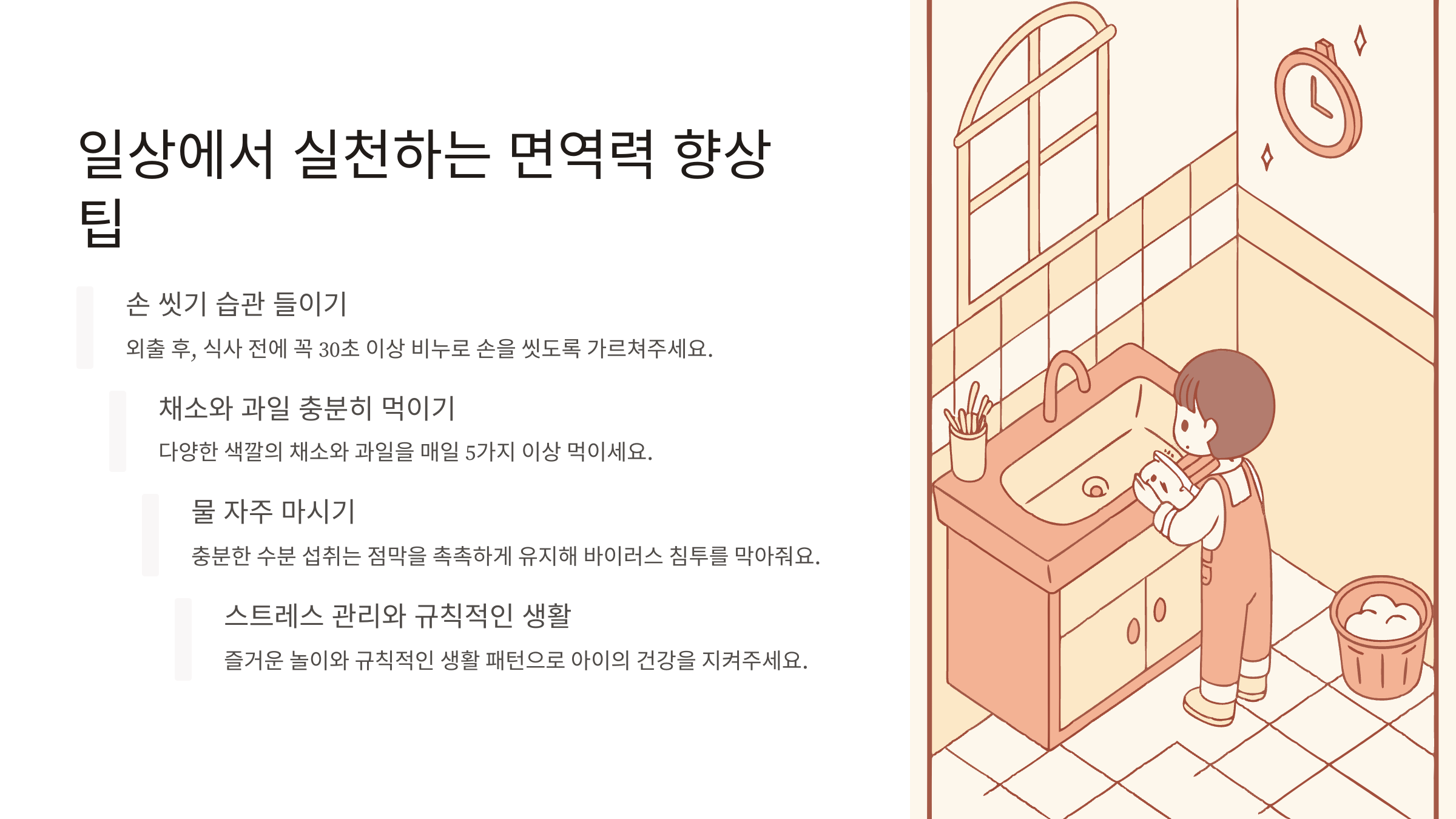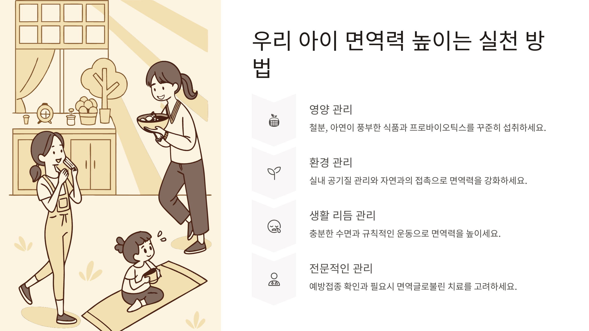 이렇게 면역체계가 완전히 성숙하기 전까지는 외부 감염에 더 취약할 수밖에 없어요. 하지만 적절한 관리로 아이의 면역력을 높일 수 있답니다!