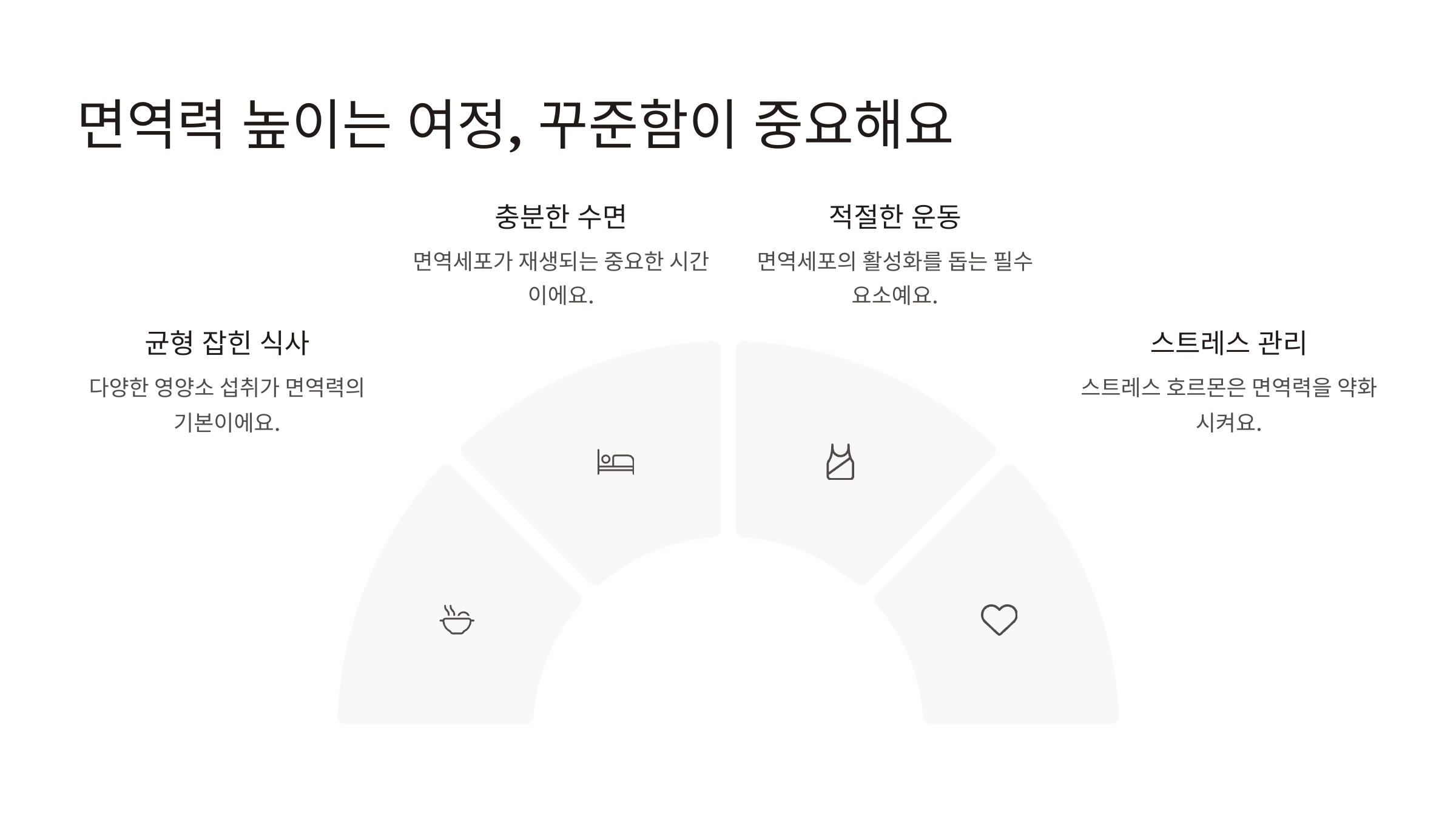 - 규칙적인 운동: 주 150분의 중간 강도 운동(심박수 120-140)이 면역력 향상에 도움이 돼요.