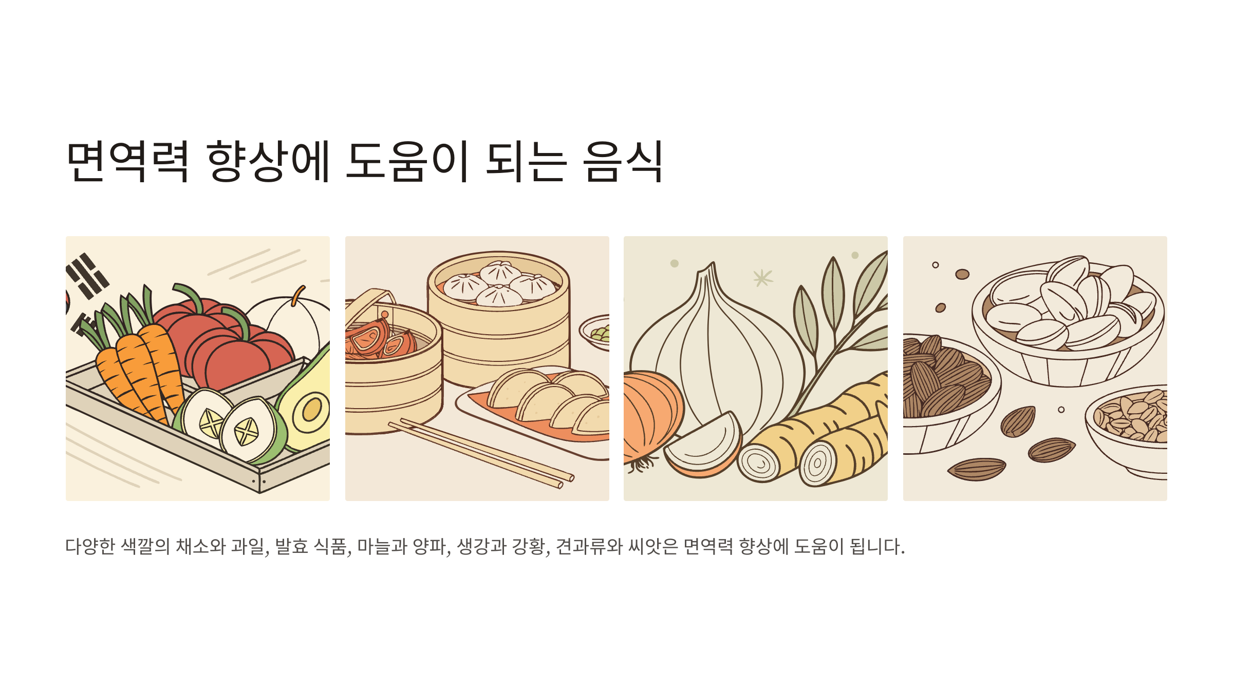 - 생강과 강황: 항염증 효과가 있어 면역력 향상에 도움이 돼요.