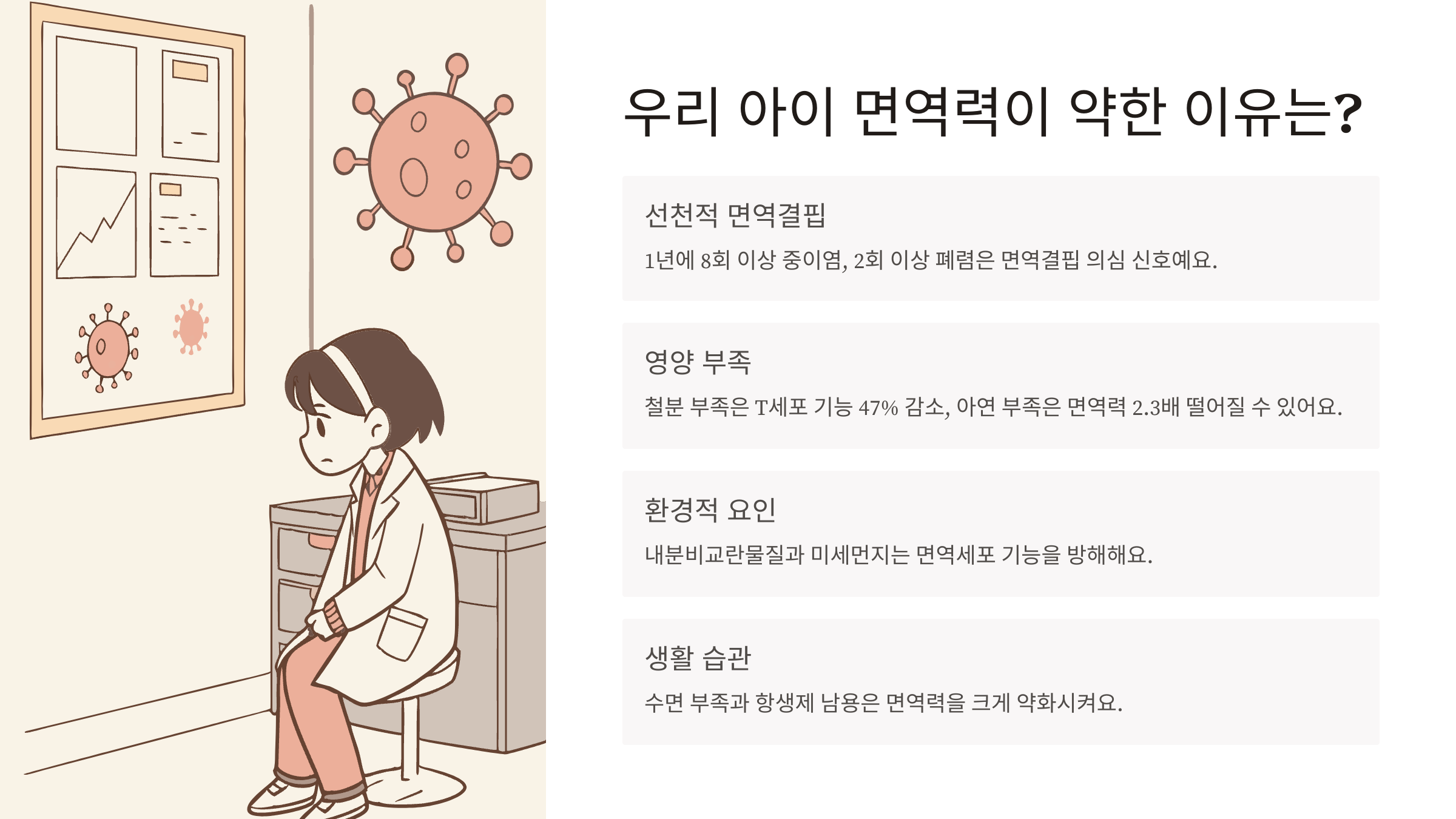 - 수면 부족: 5세 아이가 9시간 미만으로 자면 NK세포(자연살해세포) 활성이 32%나 떨어져요.