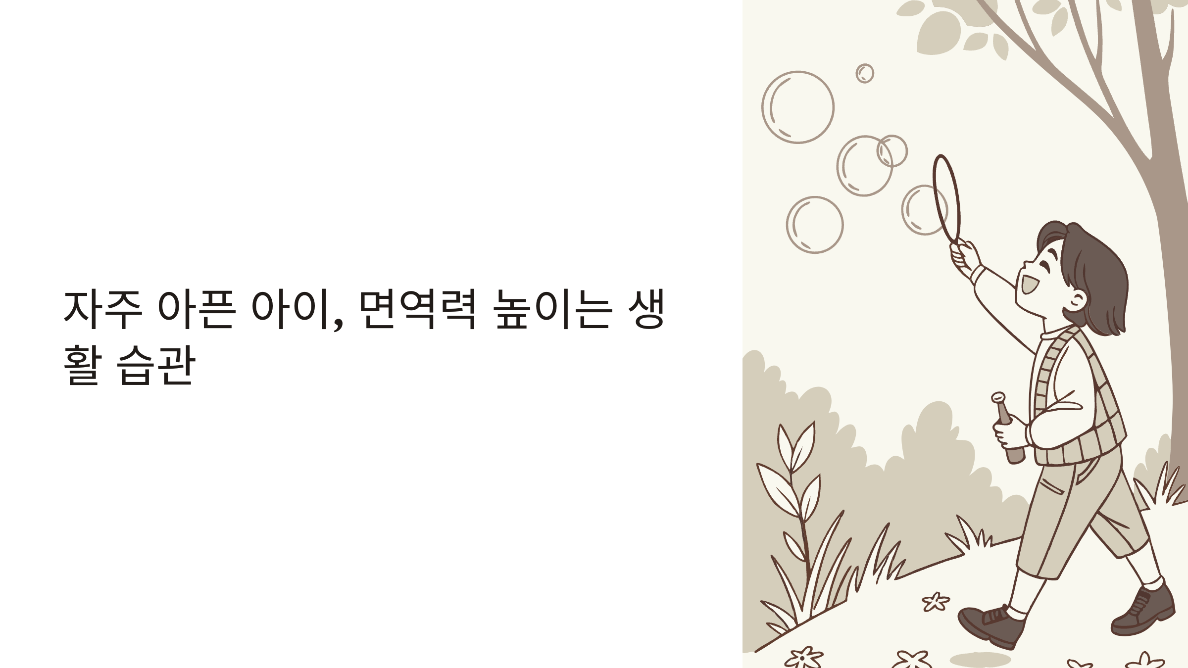 안녕하세요! 아이가 자주 아파서 걱정이신가요? 대한소아알레르기호흡기학회 자료에 따르면 7세 미만 아이들의 38%가 1년에 6회 이상 상기도 감염을 겪는다고 해요. 오늘은 면역력이 약한 아이들을 위한 생활 관리법을 알아볼게요!