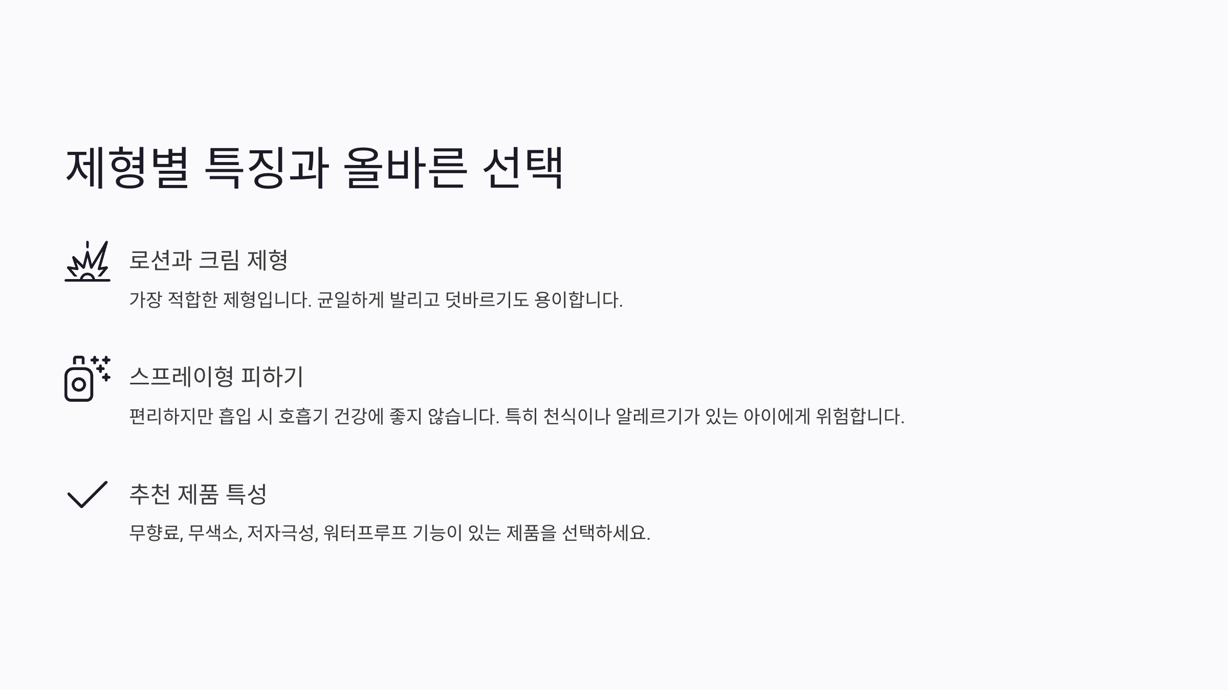 스프레이형 제품은 편리하지만 아이가 흡입할 경우 호흡기 건강에 좋지 않은 영향을 줄 수 있으므로 권장하지 않습니다. 특히 천식이나 알레르기와 같은 호흡기 질환을 가진 아이에게는 증상을 악화시킬 수 있어 더욱 주의해야 합니다.