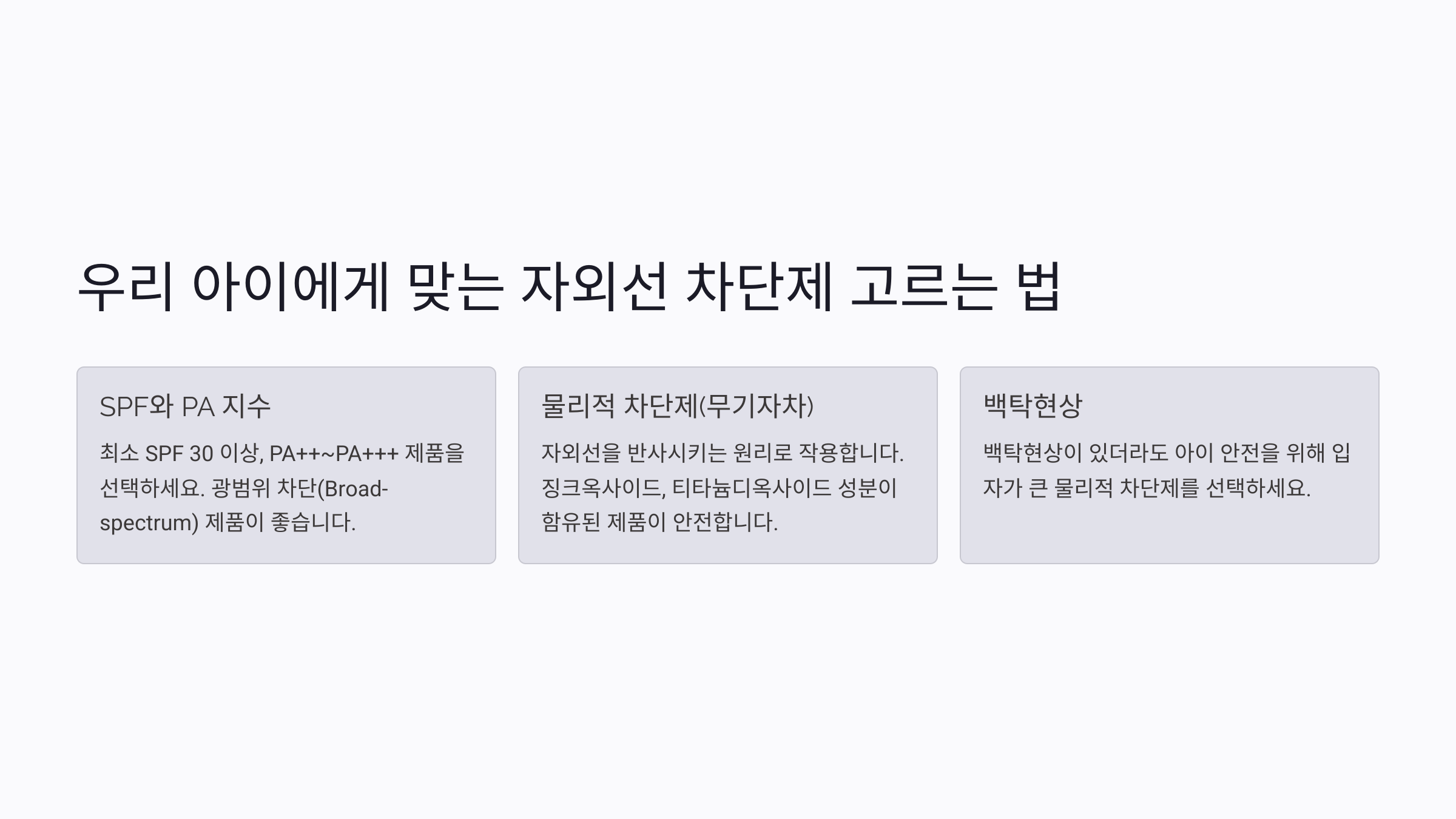 자외선 차단제는 크게 물리적 차단제(무기자차)와 화학적 차단제(유기자차)로 나뉩니다. 어린이에게는 독성이 없고 안정적이며 피부 자극이 적은 물리적 차단제가 권장됩니다.