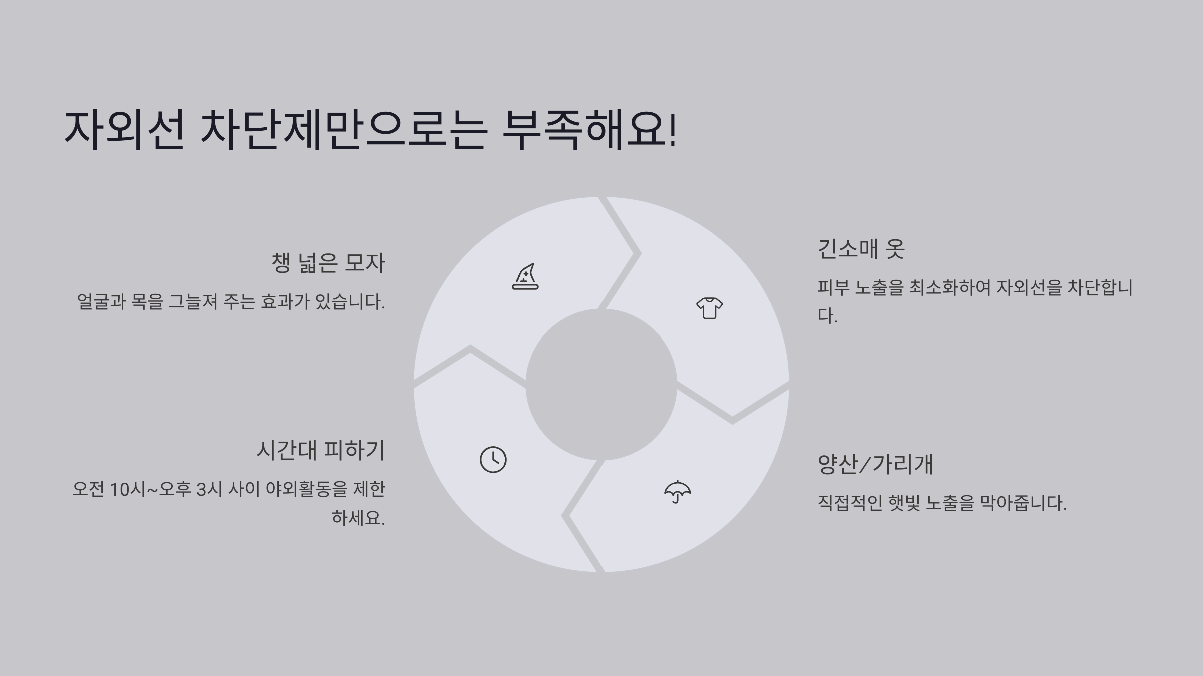 자외선 차단제만으로는 완벽한 보호가 어려우므로 챙이 넓은 모자, 긴소매 옷, 유모차 가리개 등을 함께 사용하는 것이 좋습니다.