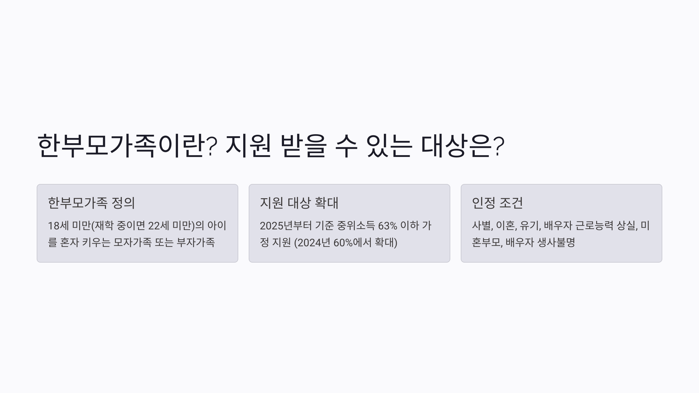 2025년부터는 소득인정액이 기준 중위소득 63% 이하인 가정이라면 지원을 받을 수 있게 되었어요. 이는 2024년 기준 중위소득 60%에서 확대된 것으로, 더 많은 한부모가족들이 혜택을 받을 수 있게 되었답니다.