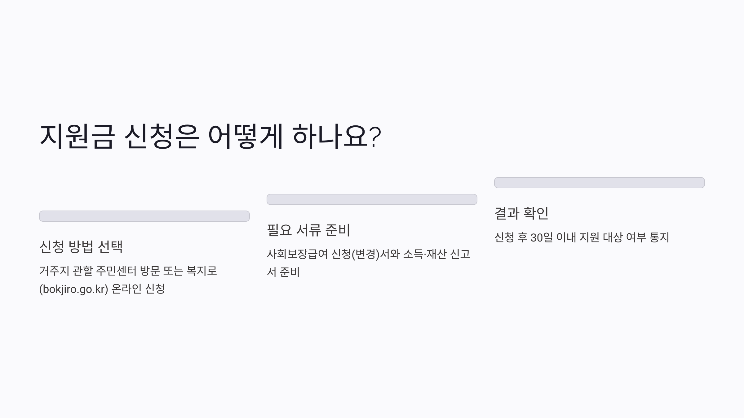 - 복지로(bokjiro.go.kr) 홈페이지에서 온라인으로 신청할 수 있습니다