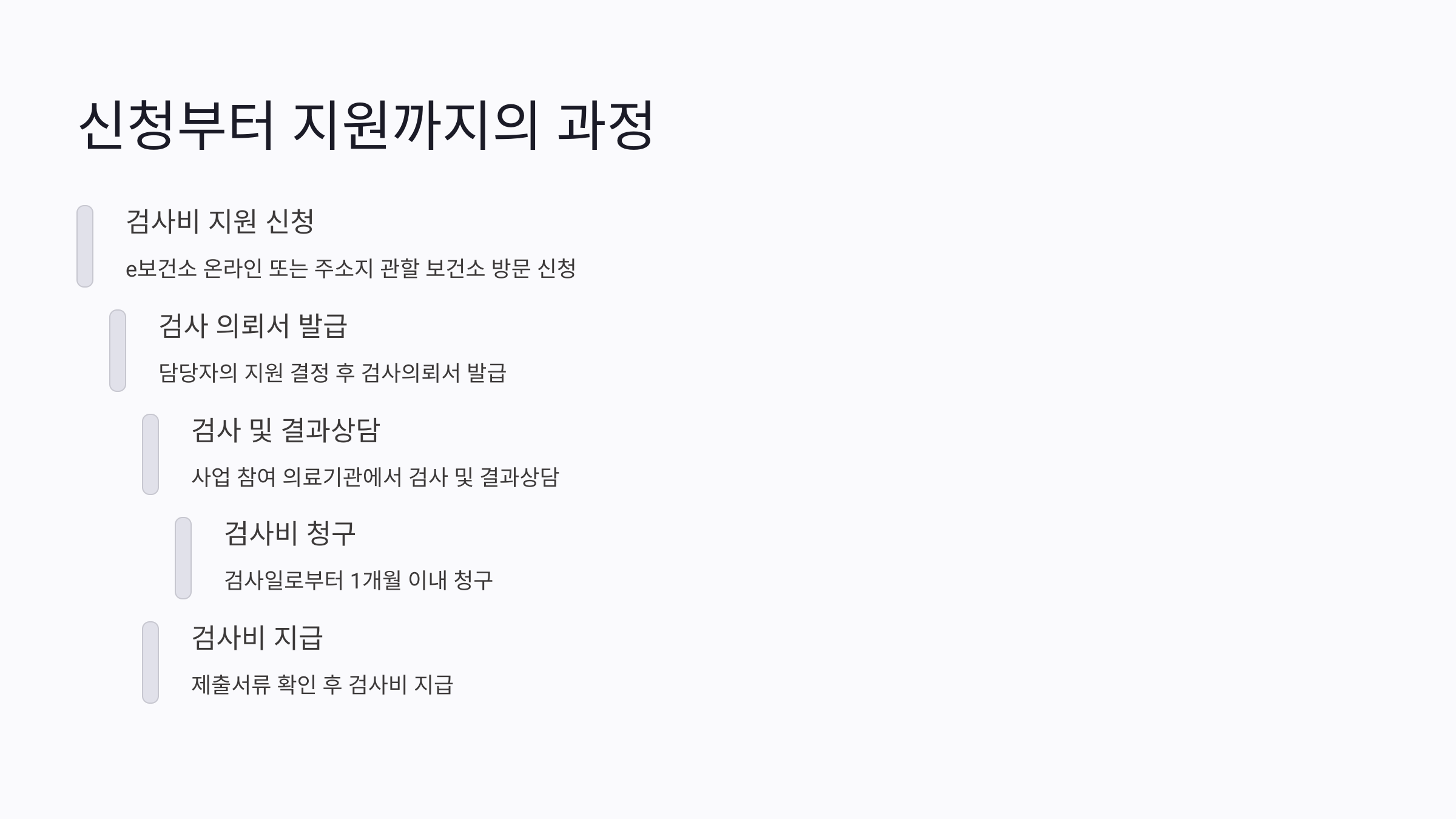 - 검사 및 결과상담: 사업 참여 의료기관에서 검사 및 결과상담(신청일로부터 3개월 이내 검사해야 함)