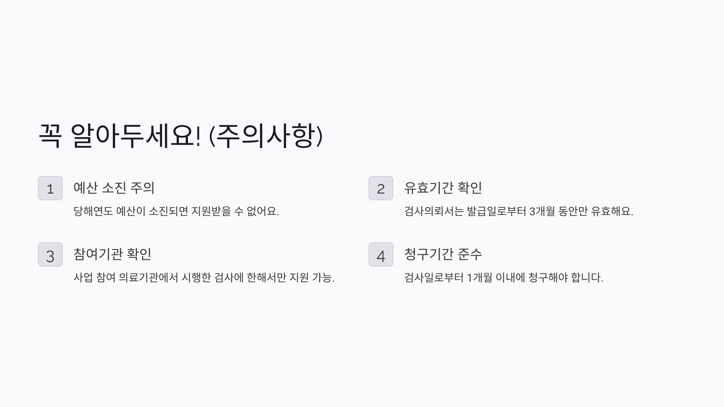 - 허위 기재, 중복 지원, 급여 검사, 참여 의료기관 외 기관에서 검사 등의 경우에는 지원금이 제한되거나 이미 받은 지원금을 환수당할 수 있습니다.