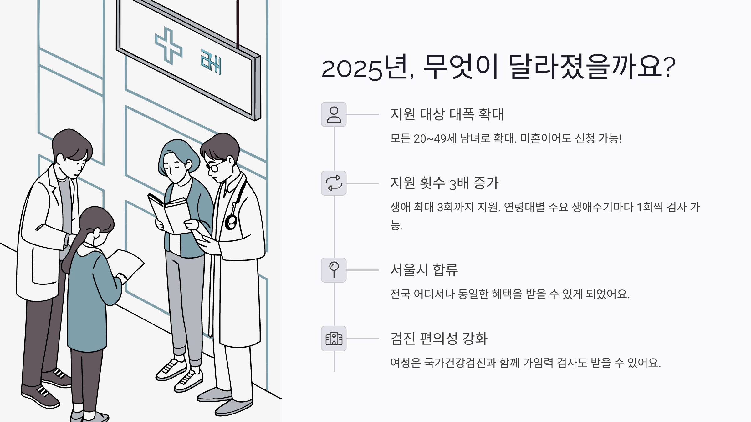 기존에는 주로 기혼자 중심이었던 지원 대상이 2025년부터는 결혼 여부나 자녀 수와 관계없이 모든 20~49세 남녀로 확대되었어요. 미혼이어도, 아직 아이를 가질 계획이 없어도 생식건강을 체크하고 싶은 분이라면 누구나 신청 가능합니다!