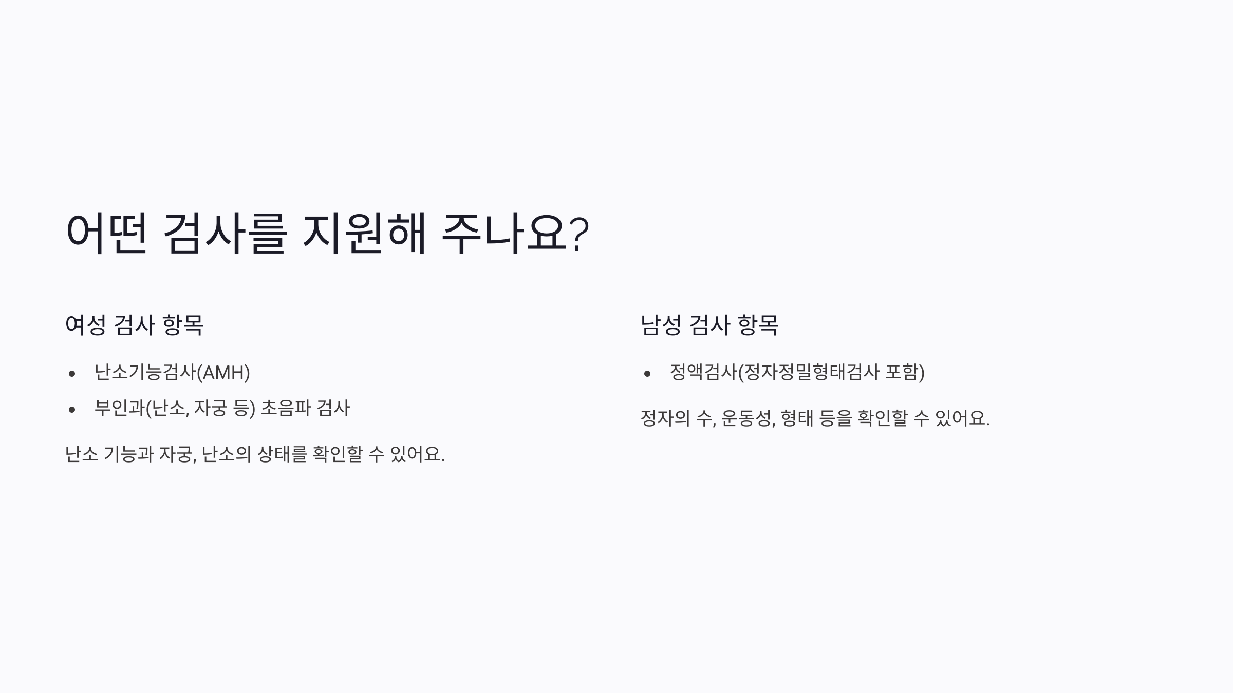 성별에 따라 지원하는 검사 항목이 다른데요, 자세히 살펴볼게요: