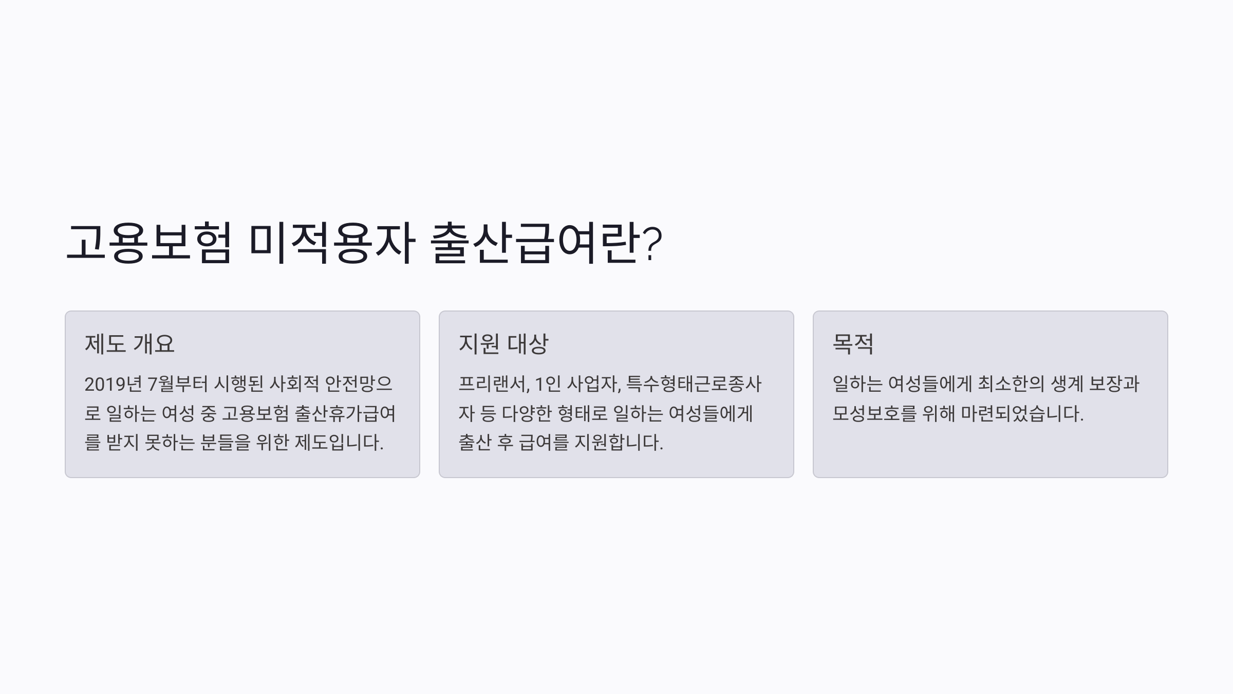 2019년 7월부터 시행된 '고용보험 미적용자 출산급여'는 일하는 여성이면서도 고용보험의 '출산휴가급여'를 받지 못하는 분들을 위한 제도예요. 쉽게 말해, 일은 하고 있지만 회사에서 출산휴가급여를 받을 수 없는 여성들에게 최소한의 생계 보장과 모성보호를 위해 마련된 사회적 안전망이랍니다.