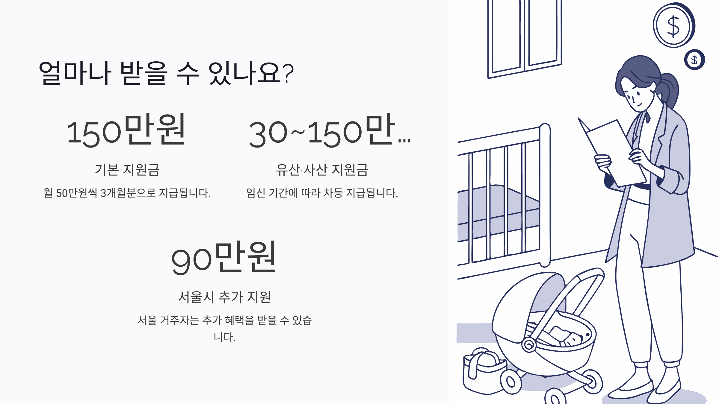 - 일반 출산: 90만원 추가 지원 (고용노동부 150만원 + 서울시 90만원 = 총 240만원)