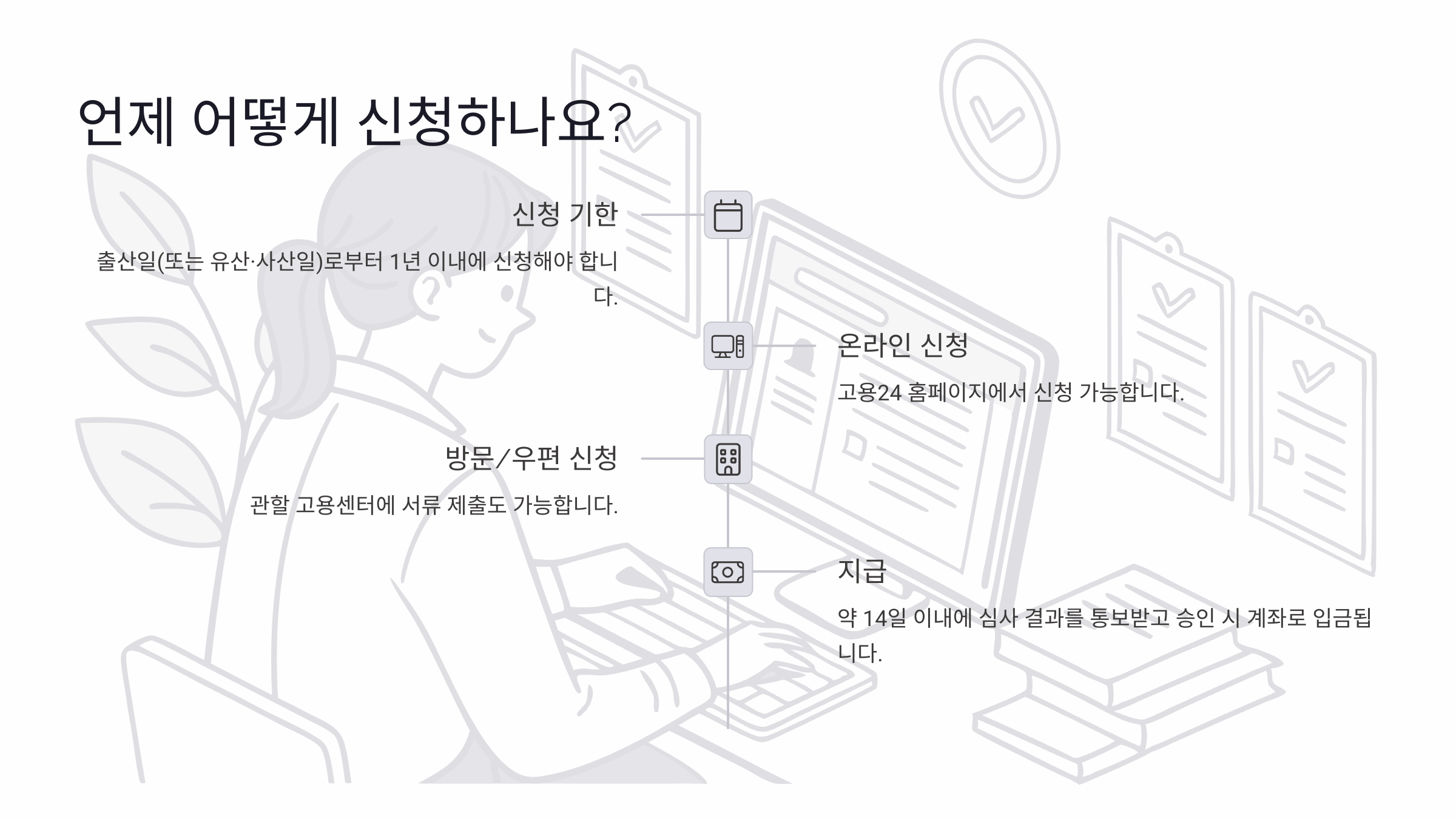 출산일(또는 유산·사산일)로부터 1년 이내에 신청해야 해요. 이 기간을 놓치면 받을 수 있는 권리가 사라지니 꼭 기억하세요!