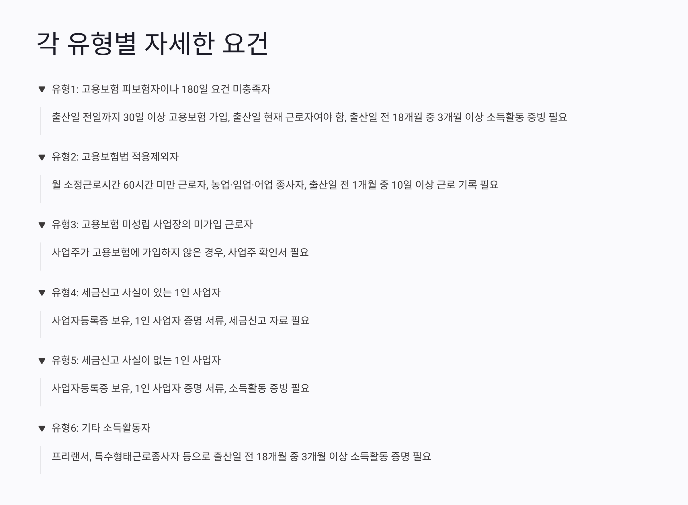 - 유형1: 고용보험에 가입했지만 가입기간이 짧아서(180일 미만) 출산급여를 못 받는 분