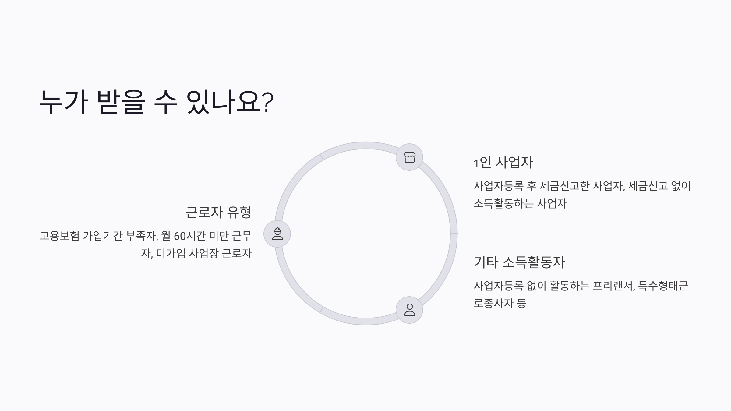 - 유형2: 월 60시간 미만 근무자(주 15시간 미만), 농어업 종사자 등 고용보험법 적용제외자