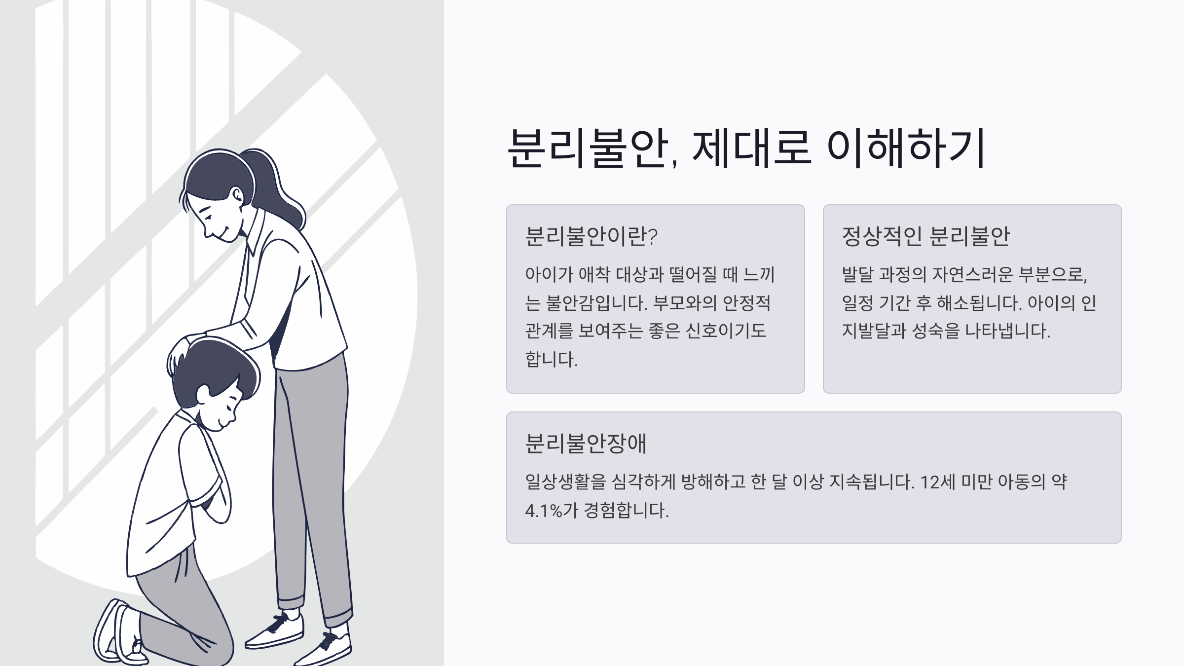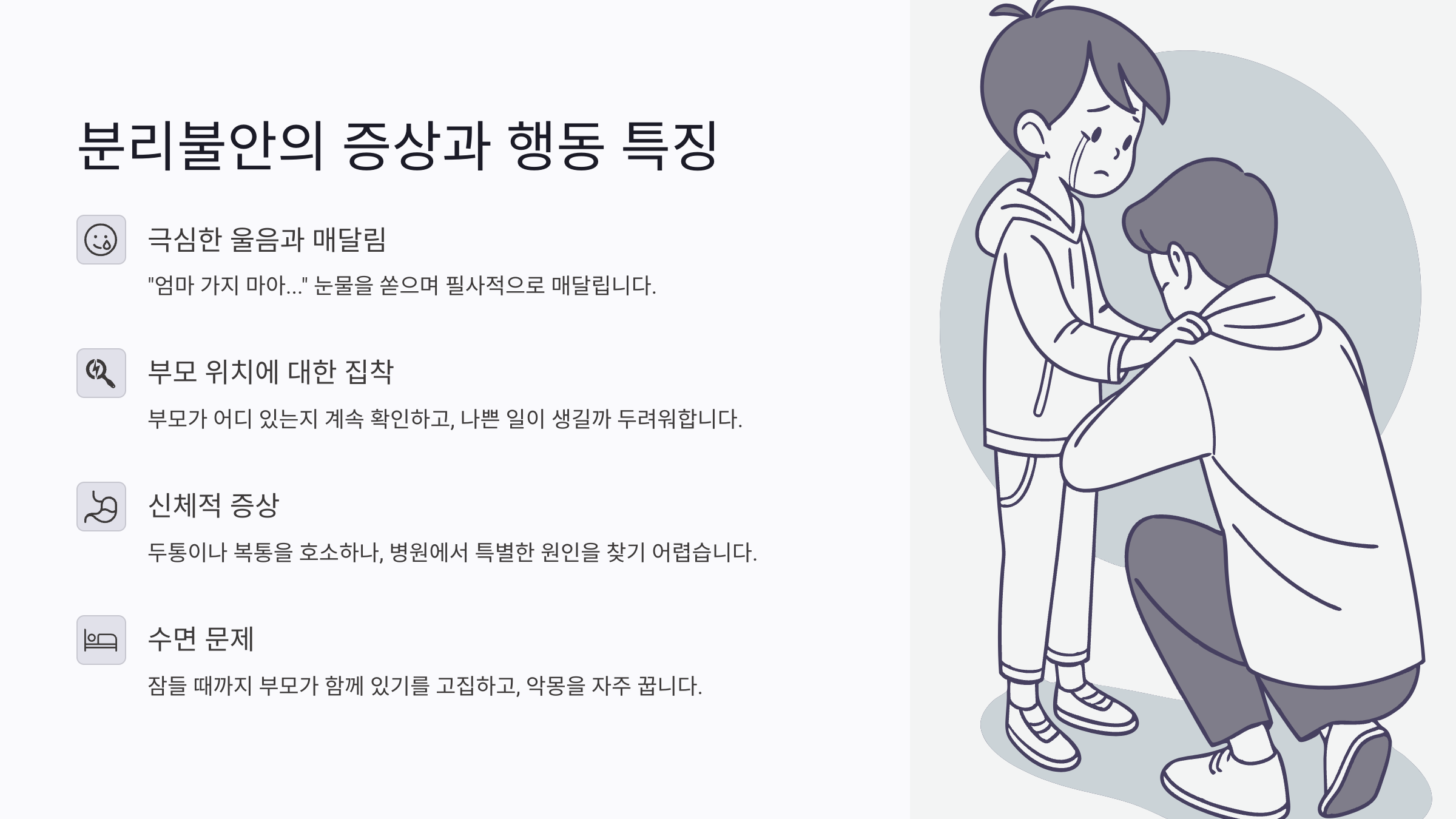 안녕하세요, 오늘은 많은 부모님들이 한 번쯤 겪게 되는 '아이의 분리불안'에 대해 자세히 알아보려고 해요. "엄마 가지 마..." 하며 눈물을 쏟는 아이를 두고 떠나야 할 때 마음이 찢어지는 것 같죠? 걱정 마세요. 이건 아이가 건강하게 성장하는 과정에서 자연스럽게 겪는 단계랍니다.
