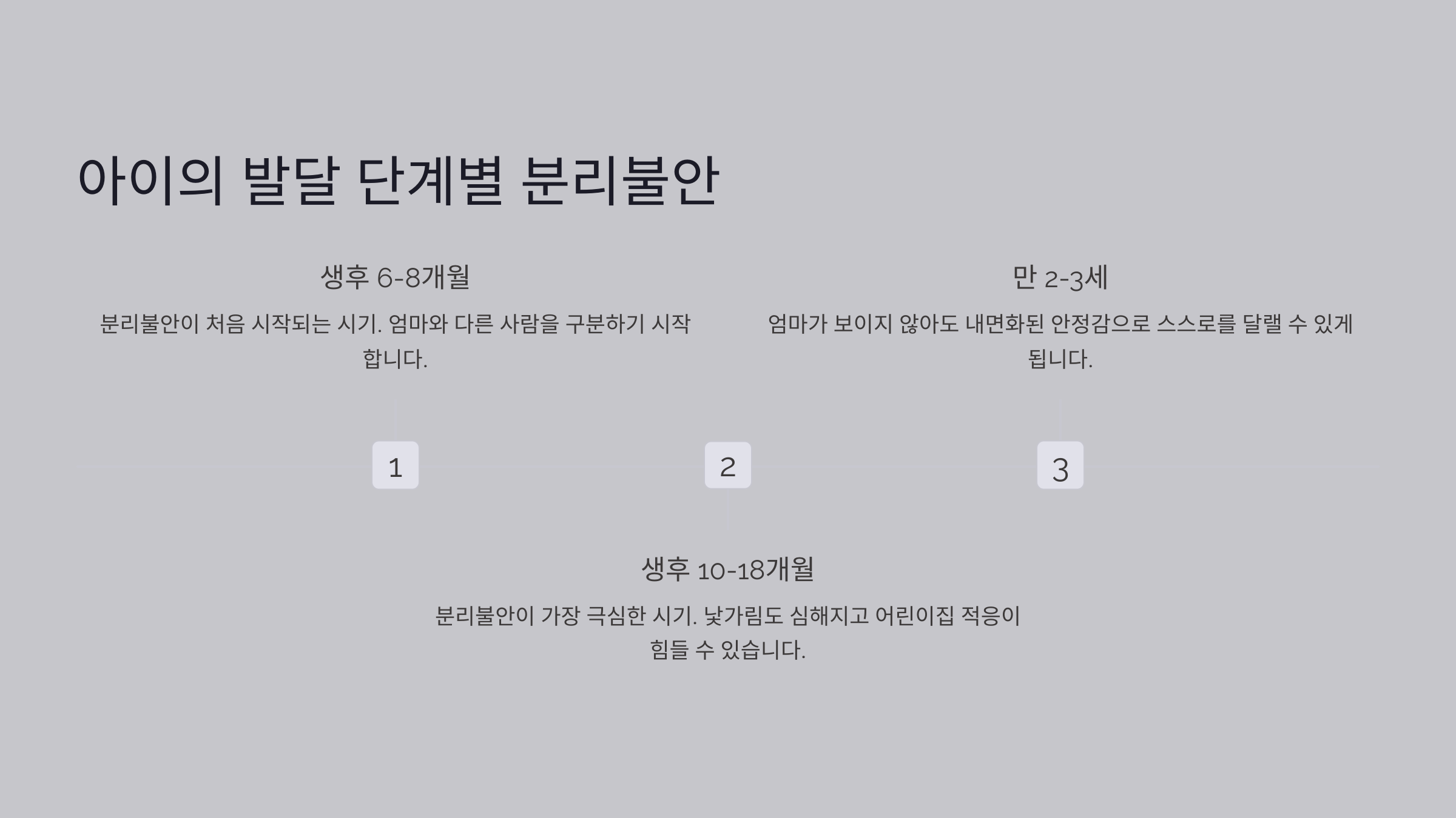 - 생후 10-18개월: 분리불안이 가장 극심한 시기로, 낯가림도 심해집니다. 이 시기에는 어린이집 적응이 특히 힘들 수 있어요.